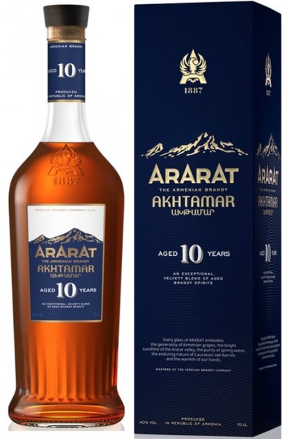 Бренди Ararat 10 лет 0,7 л 40% АХТАМАР обладает красивым янтарным цветом, приятным ароматом с нотами сушеных слив, корицы и сладким вкусом, в котором преобладают оттенки дуба, орехов, сливок и ванили. Наслаждайтесь превосходным бренди, который станет изысканным дополнением к любому особенному вечеру. Для вас.