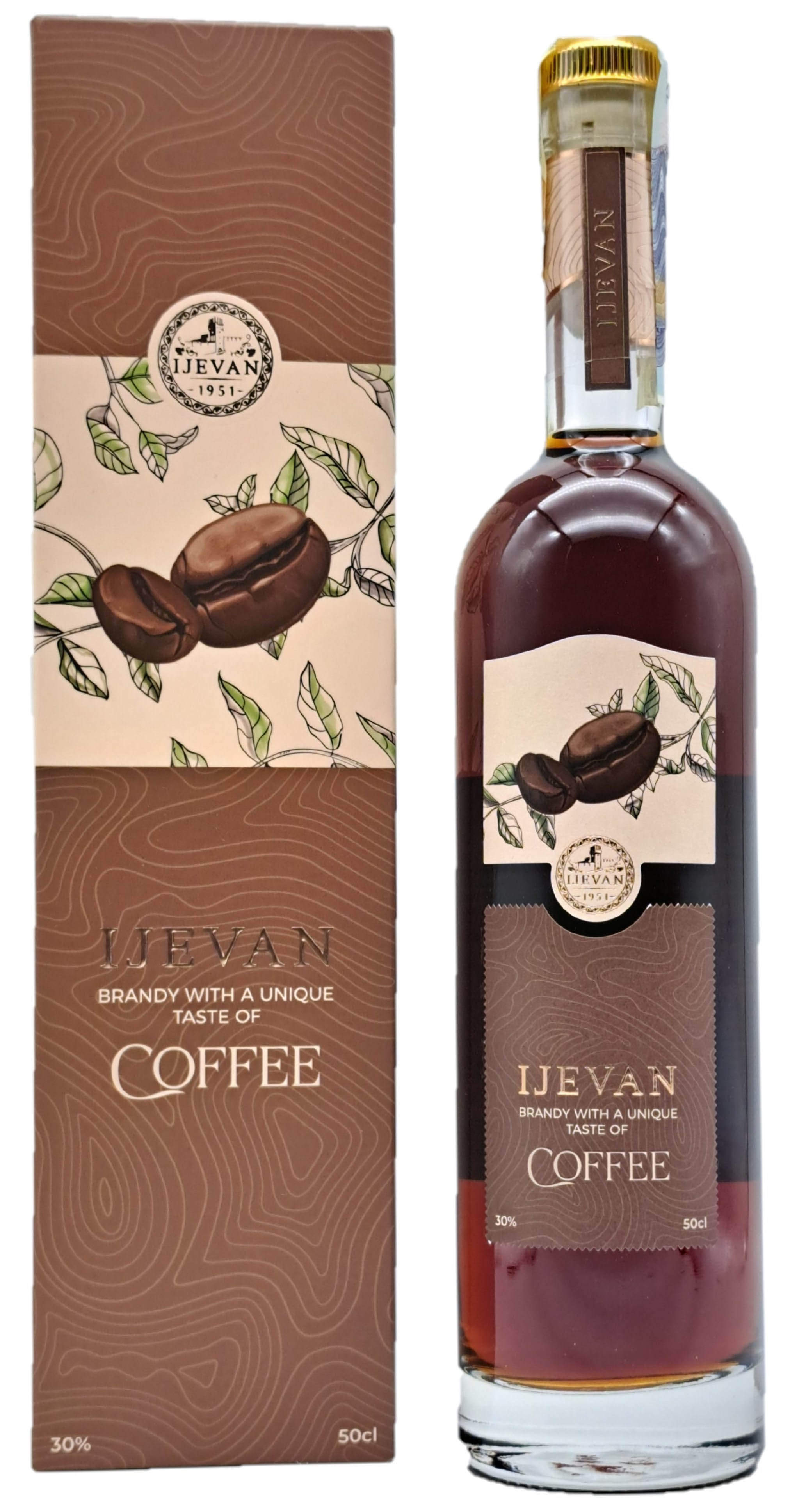 Бренди кофейный 7 лет 0,5Л 30% IJEVAN производится в городе Иджеван в Армении. Бренди характеризуется каштаново-коричневым цветом, выделяется нежным вкусом и ароматом кофе. Он также отличается полнотой, нежностью и длительным послевкусием. Время выдержки бренди составляет не менее 7 лет. Рекомендуется подавать при комнатной температуре.