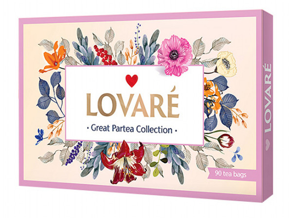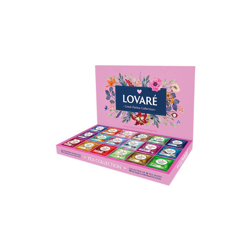 LOVARÉ Great Partea Collection — это коллекция любимых вкусов пакетированных чаёв Lovaré. Она порадует любителей чёрного, зелёного, травяного, фруктового чая, а также чая ройбуш. Красочная подарочная упаковка идеально подойдёт в качестве презента для близких. Коллекция включает 18 вкусов по 5 пакетиков каждого, что позволяет попробовать разнообразные чаи и найти свой любимый.