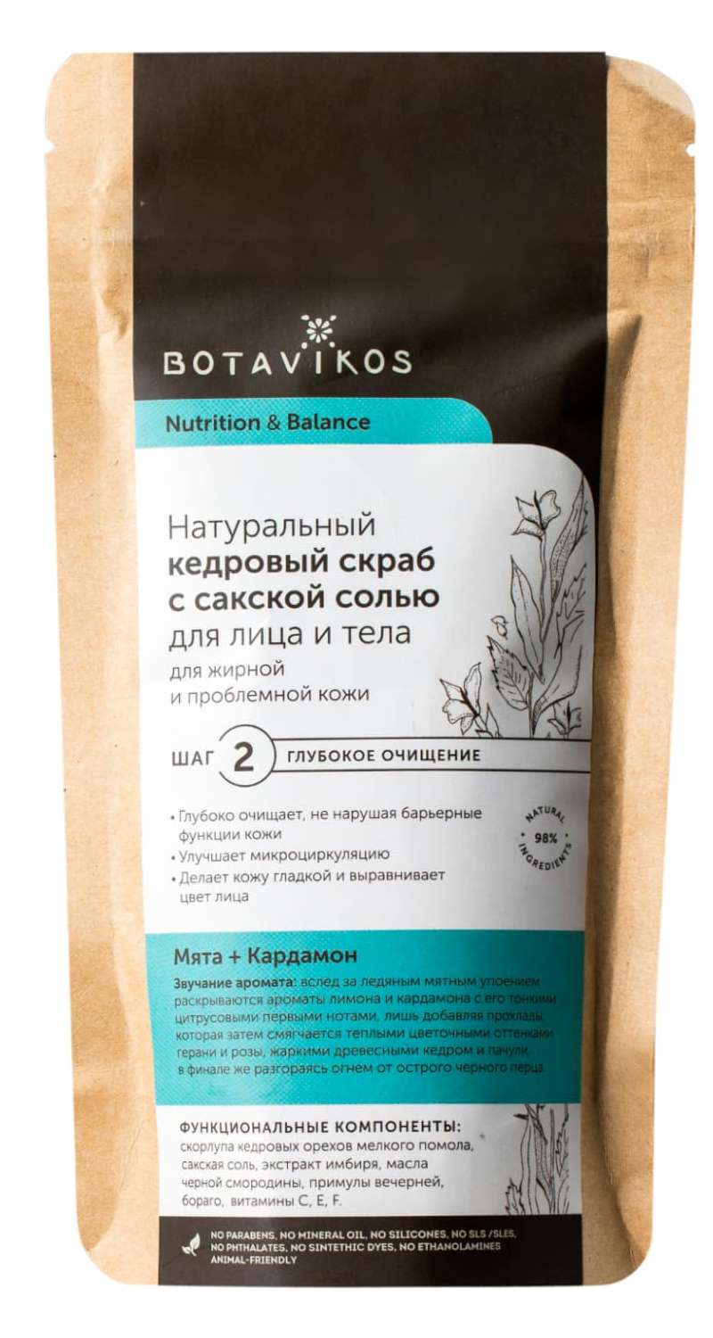 Přírodní cedrový peeling se sakskou solí na obličej a tělo. Pro mastnou a problematickou pleť. Funkční složky: jemně mleté skořápky piniové oříšky, sakská sůl, zázvorový extrakt, kyselina salicylová, oleje z černého rybízu, pupalkový olej, brutnák lékařský, vitamíny C, E, F. Peeling hluboce čistí, aniž by narušoval bariérové funkce pokožky, zlepšuje mikrocirkulaci, dělá pokožku hladkou a vyrovnává pleť. Vytvořeno pro kompletní péči o mastnou a problematickou pleť. Rozdrcené skořápky borovice a jemně mleté krystaly mořské soli jsou zodpovědné za hloubkové čištění pokožky od nečistot, odstraňování odumřelých buněk z povrchu pokožky, aktivaci metabolických procesů a podporu toku kyslíku a aktivních živin do pokožky, vyrovnávání úlevy, dávat tón. Zázvorový extrakt obsahuje biologicky aktivní látky, které zlepšují strukturu pokožky a mají hojivý účinek.