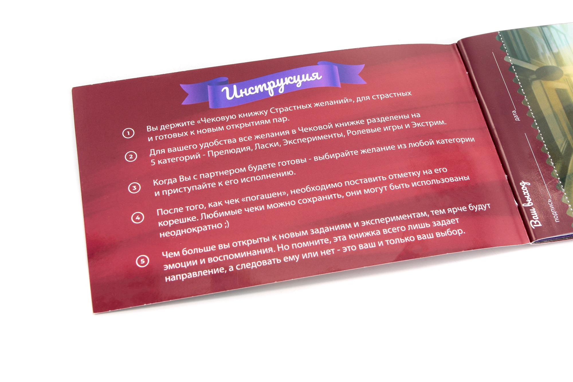 Чековая Книжка Страстных Желаний – это идеальный подарок для страстных и готовых к новым открытиям пар. Внутри вы найдете 24 чека(задания) разной степени откровенности.
