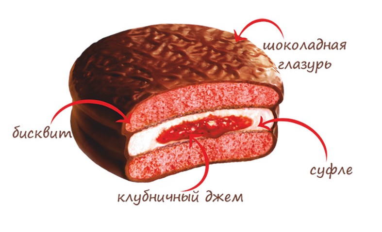 Состав: Пшеничная мука, сахар, питьевая вода, растительное масло (пальмовое масло, полностью затвердевший подсолнечный масло), фруктовая начинка с малиновым вкусом (сахар, малина 3%, глюкозо-фруктозный сироп, стабилизаторы: E1442, E440; регуляторы кислотности: E330, E331, антиоксидант E300, ароматизатор, консервант E202, краситель E120, питьевая вода), растительное масло (пальмовое масло, пальмовое ядро, эмульгаторы: E322 (соевый), E492), сухое цельное молоко, жидкое цельное яйцо, пастеризованное обезжиренное молоко; какао-порошок 2,5%, лактоза, увлажнитель E422, разрыхлитель: E500, E503, E341; глюкоза, пищевая желатин, соль, хлопья молочного шоколада 0,22% (сахар, цельное молоко, какао-масса), какао-масса, ароматизаторы, загуститель E415, сухая молочная белок, эмульгатор E322 (соевый).