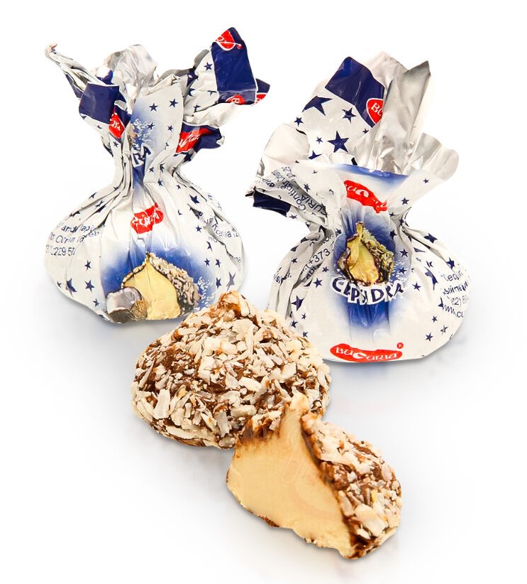 Конфета пралине куполообразной формы: сочетание кокосового масла, сухого молока, арахиса, кокосовой стружки, покрыта шоколадной глазурью и обсыпана кокосовой стружкой.
