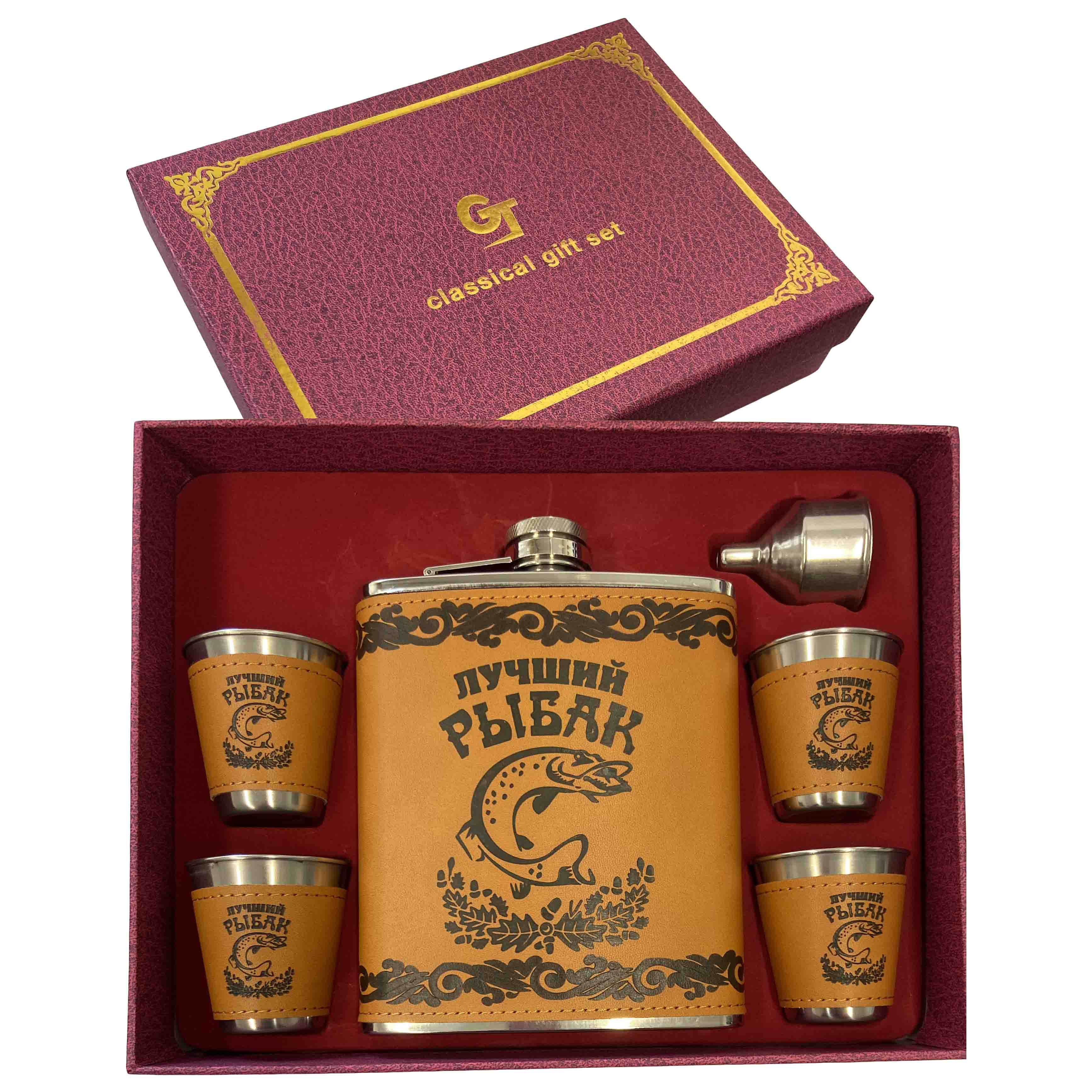 Мужской подарочный набор "Лучший рыбак" представляет собой набор, в состав которого входят: 3 стопки, фляжка из нержавеющей стали и воронка.