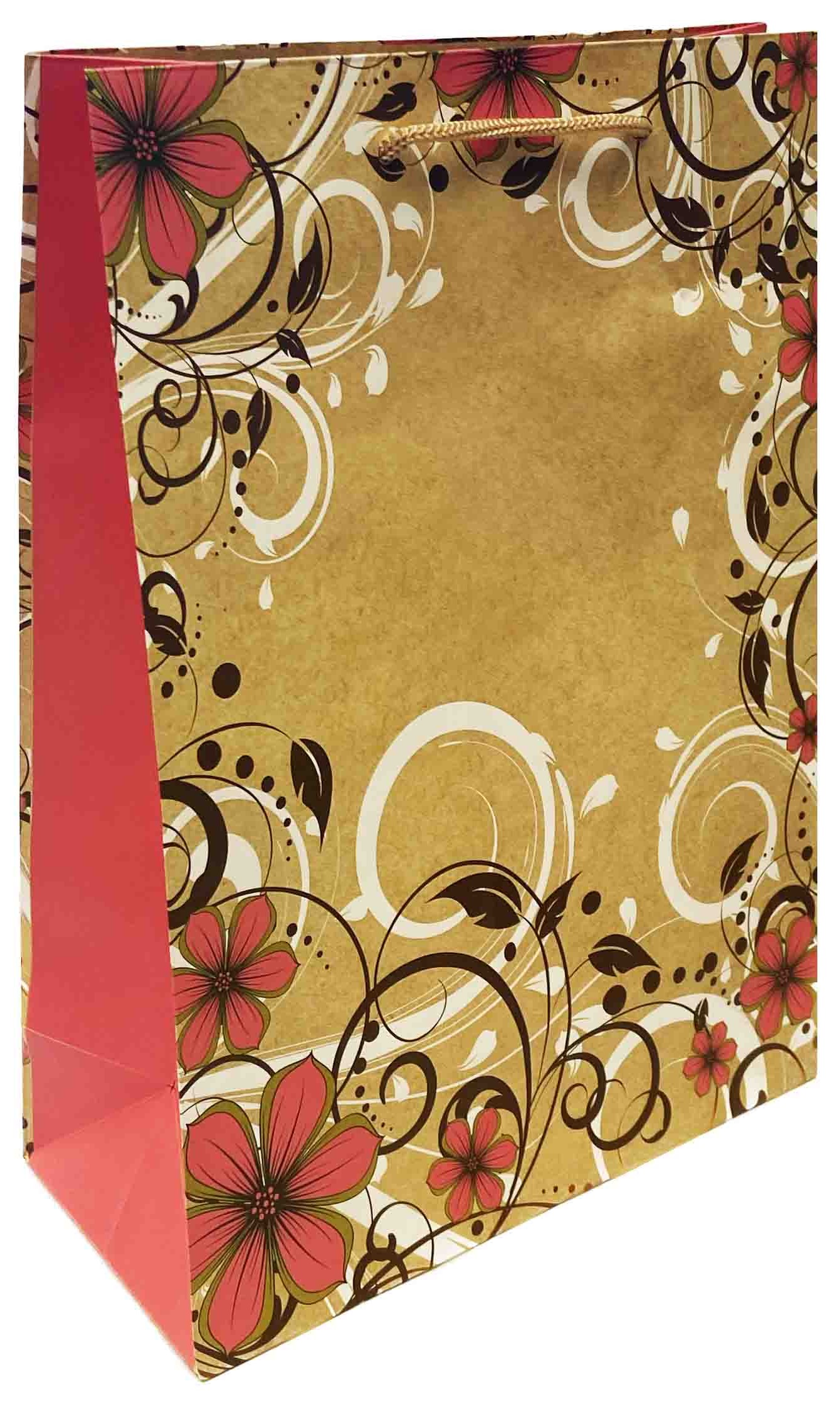 Подарочный пакет с красными цветами 26х33см крафтовый