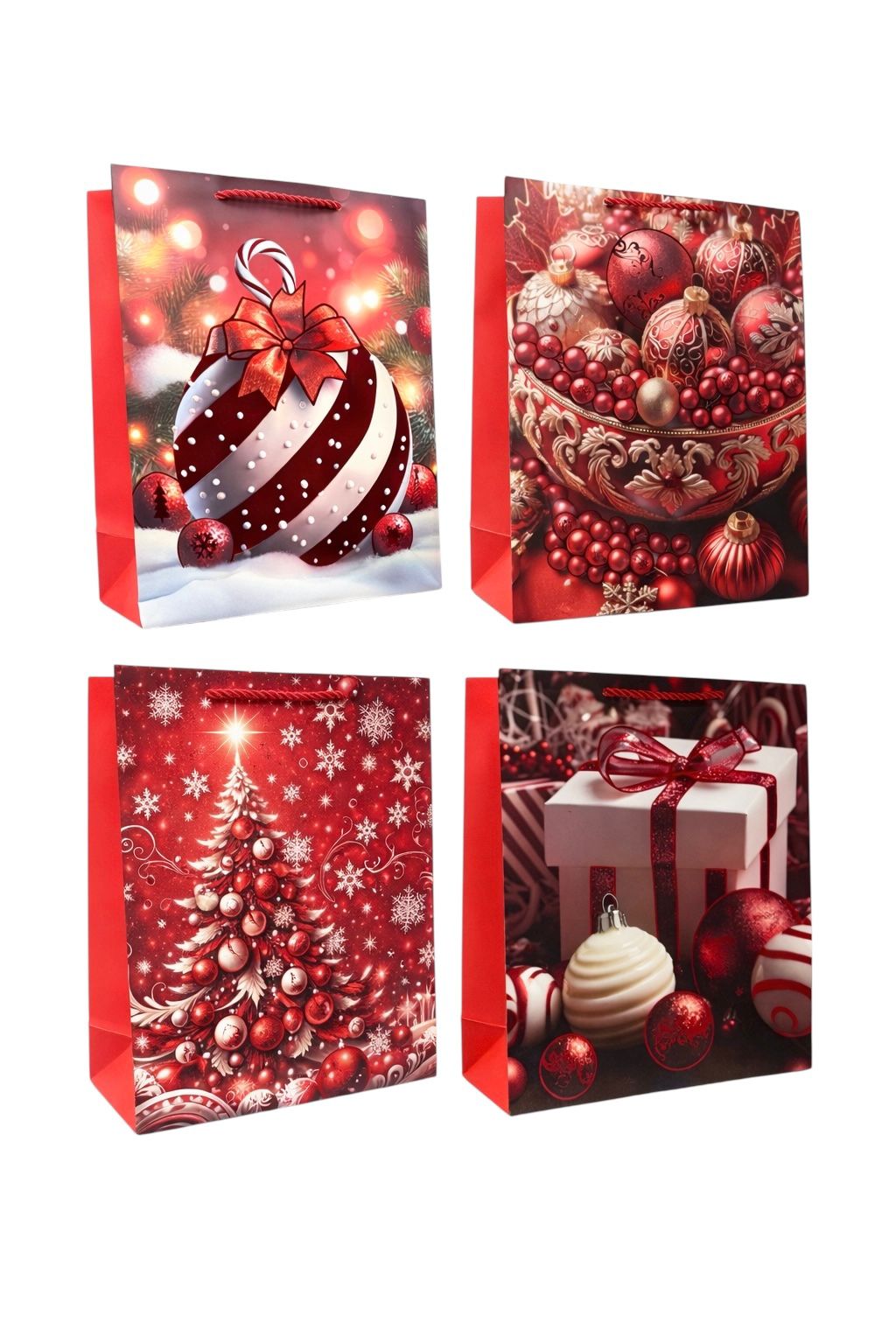 Подарочный пакет размером 26×32 см, изготовленный из плотного и прочного материала, предназначен для упаковки подарков различных форм и размеров. Декорирован праздничным рисунком с изображением ёлки, новогодних шаров и подарка на красном фоне, что придаёт упаковке новогодний и праздничный вид.