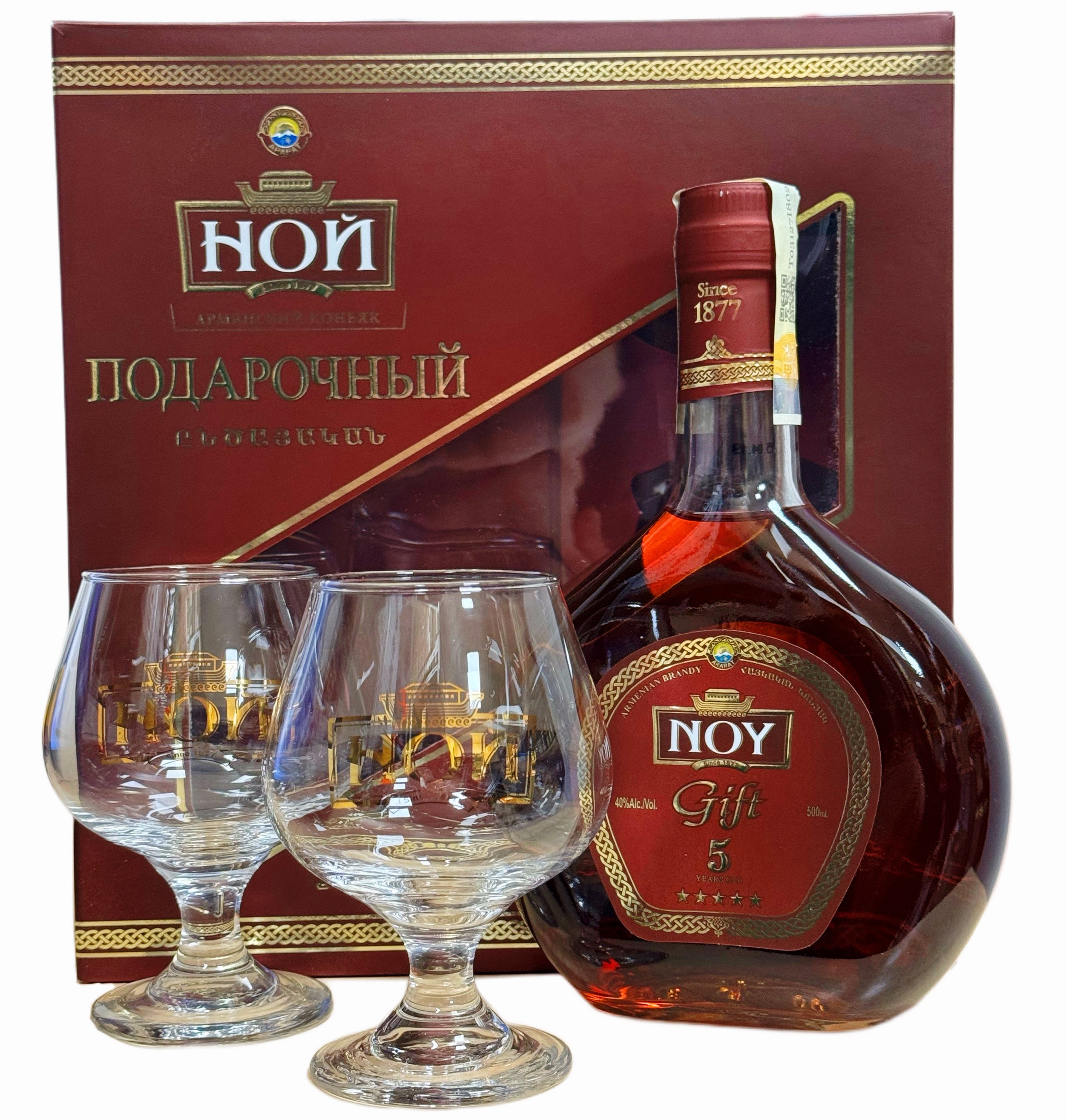 Подарочный набор бренди 5 лет 0,5Л 40% + 2 стакана NOY