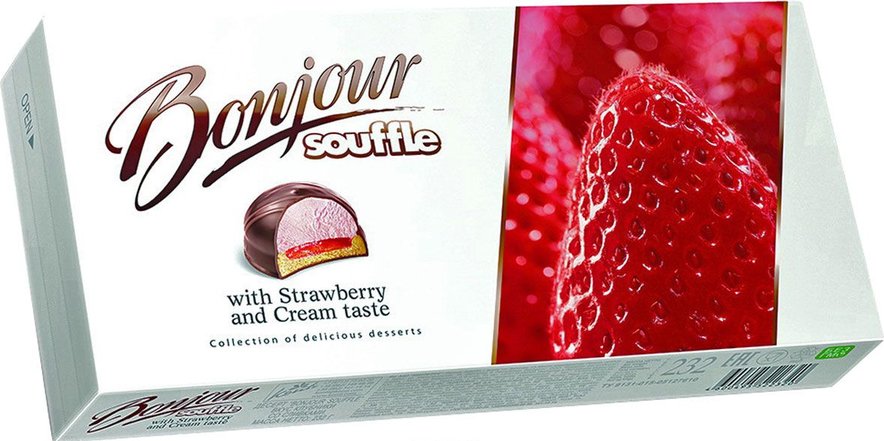 Состав: сахар, глюкозный сироп, пшеничная мука, растительный жир (частично гидрогенизированные растительные жиры и масла (подсолнечное масло, пальмовое масло, пальмовое олеиновое масло, соевое масло), эмульгатор E492, соевый лецитин, антиоксиданты E306, E300, E307), низкотемпературный какао-порошок, крахмал, увлажнитель сорбитол, регуляторы кислотности E330, E331, E270, сывороточный продукт, желирующий агент пектин, эмульгатор соевого лецитина, E471, E475, E476, яичный порошок, соль, разрыхлитель E500, E503, краситель E120, ароматизатор, сливочный порошок, концентрат ягодного пюре.