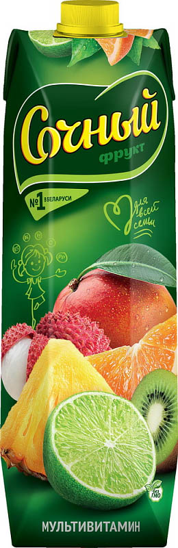 Состав: фруктовый сок (апельсин, ананас, манго, маракуйя, гуава, банан, лимон, лайм, киви и личи), яблочное пюре, сахар, регулятор кислотности: лимонная кислота, витаминная смесь (витамины: С, РР, В5, В6). , Б9), подготовленная питьевая вода. Изготовлено из концентрированного сока Минимальная объемная доля сока и пюре 50%.