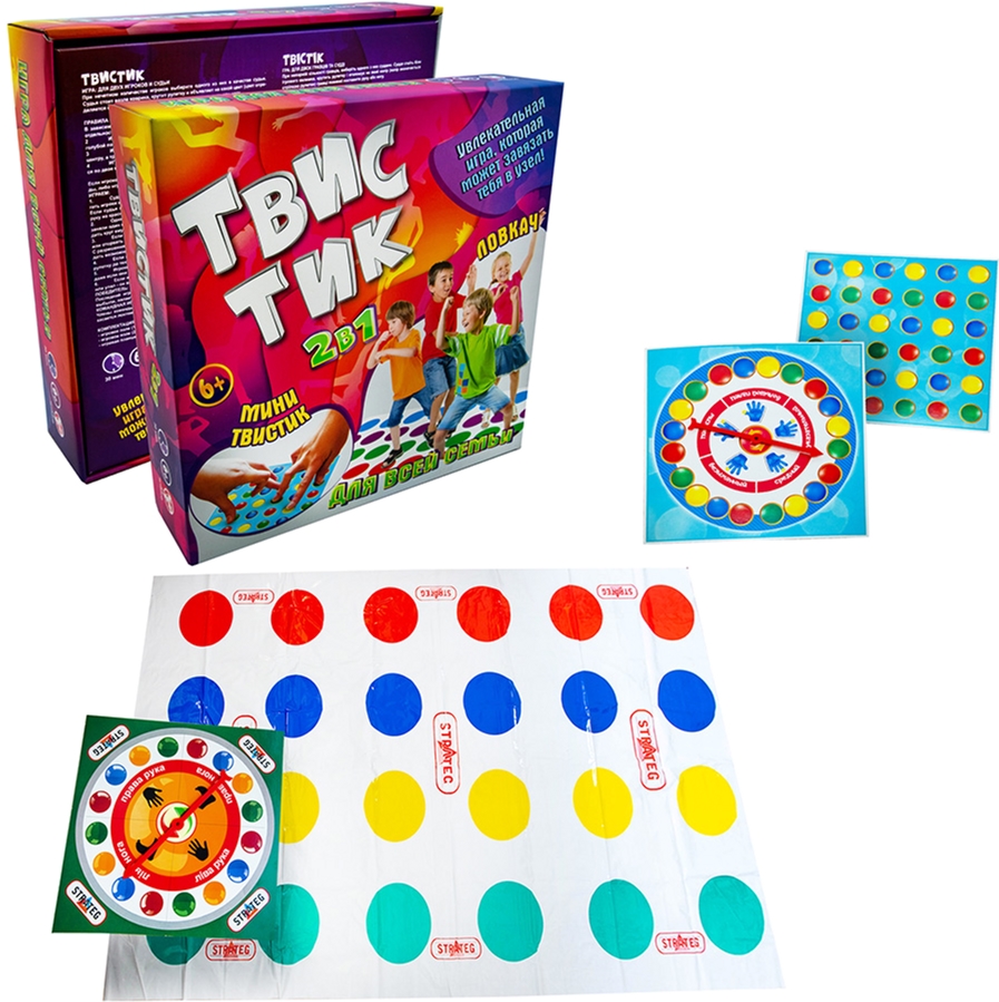 Веселое развлечение для компании – игра «ТвисТик» (Стратег 30500) даст возможность увлекательно провести время и при этом развить память, внимательность, чувство объема и ловкость. Представляет собой разновидность известной игры Твист в двух вариантах – стандартном, в который можно играть на полу, и мини варианте для игры на столе. Правила игры просты – на полу располагается игровое поле с нанесенными кругами различных цветов, на которые участник ставит ноги или руки в соответствии с цветом, выпавшим на рулетке. Проигрывает тот участник, который коснется пола любой частью тела кроме ног или рук. Веселый смех и забавные позы участников гарантированы! В мини-варианте игровое поле малого размера располагается на столе и в игре участвуют пальцы рук. Играть можно и командами по несколько человек. Правила просты, но игра захватит участников с первой партии.