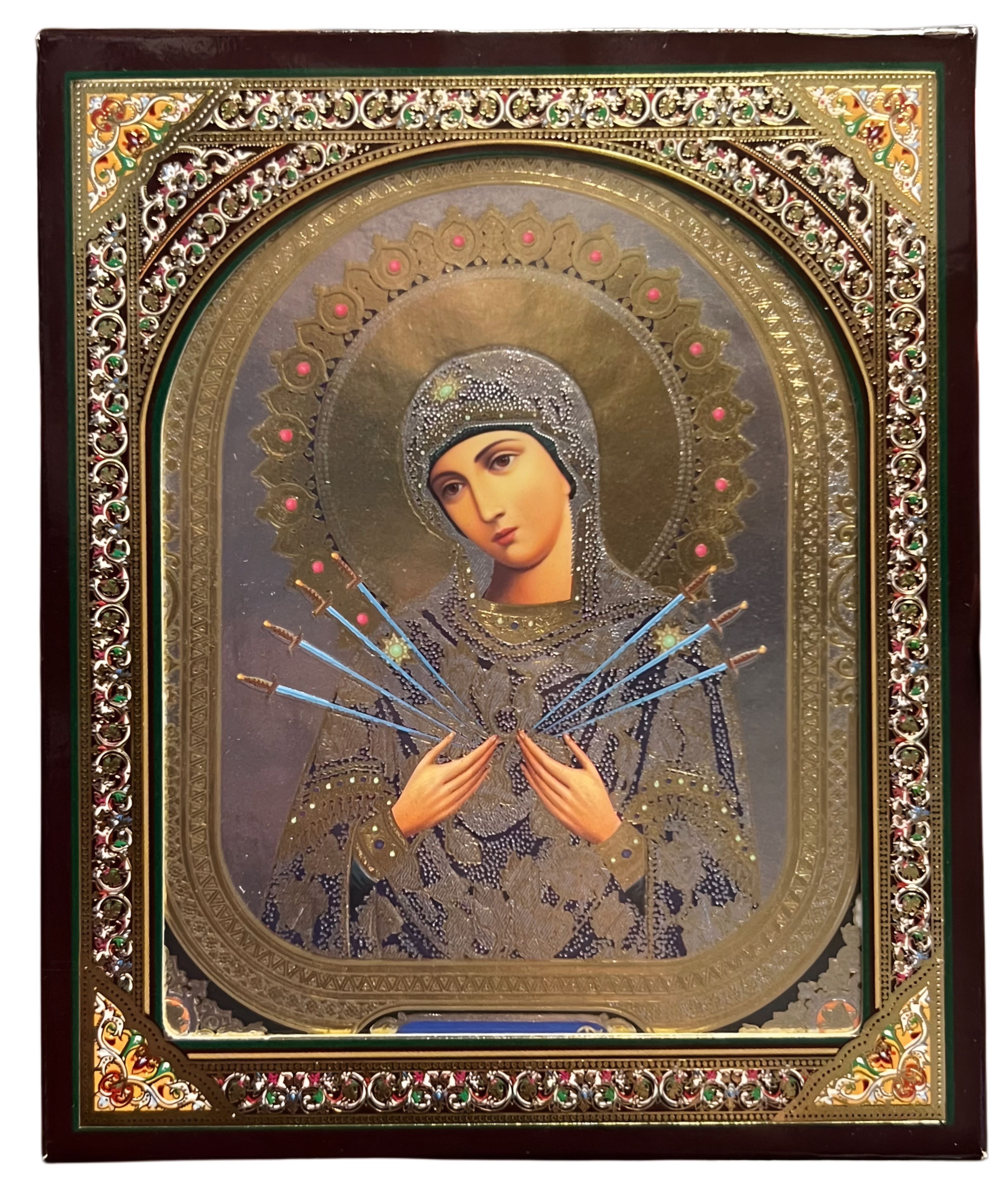 Икона деревянная Семистрельная 10х12см в киоте (серебреный фон)