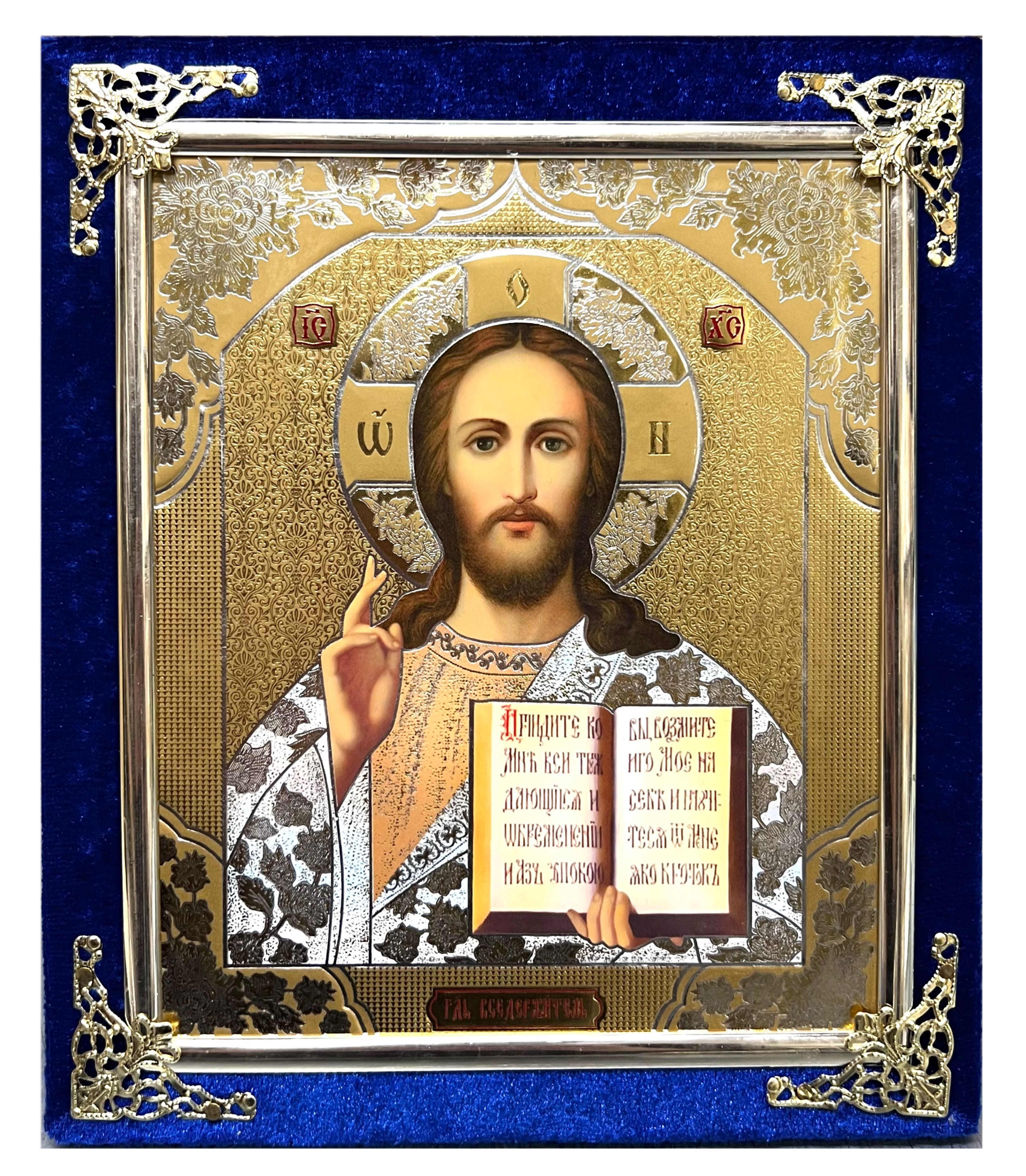 • предварительный просмотр Икона в бархате 15х18см Спаситель (синяя)
