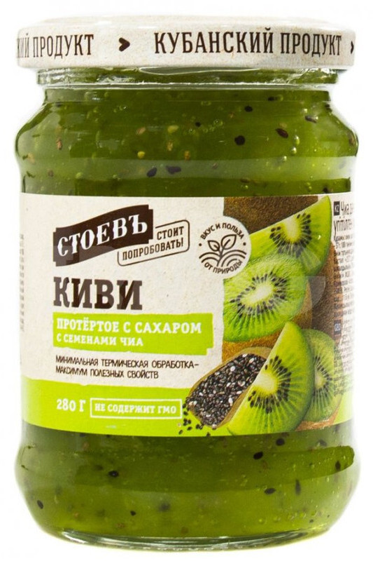 Протёртое киви с сахаром и семенами чиа от бренда «Стоевъ» — это натуральный продукт, объединяющий в себе сладость киви и полезные свойства семян чиа. Он обладает нежной пюреобразной консистенцией и выраженным фруктовым вкусом. Такой продукт идеально подходит в качестве дополнения к чаю, для подачи к блинам и оладьям, а также для использования в домашней выпечке и десертах.