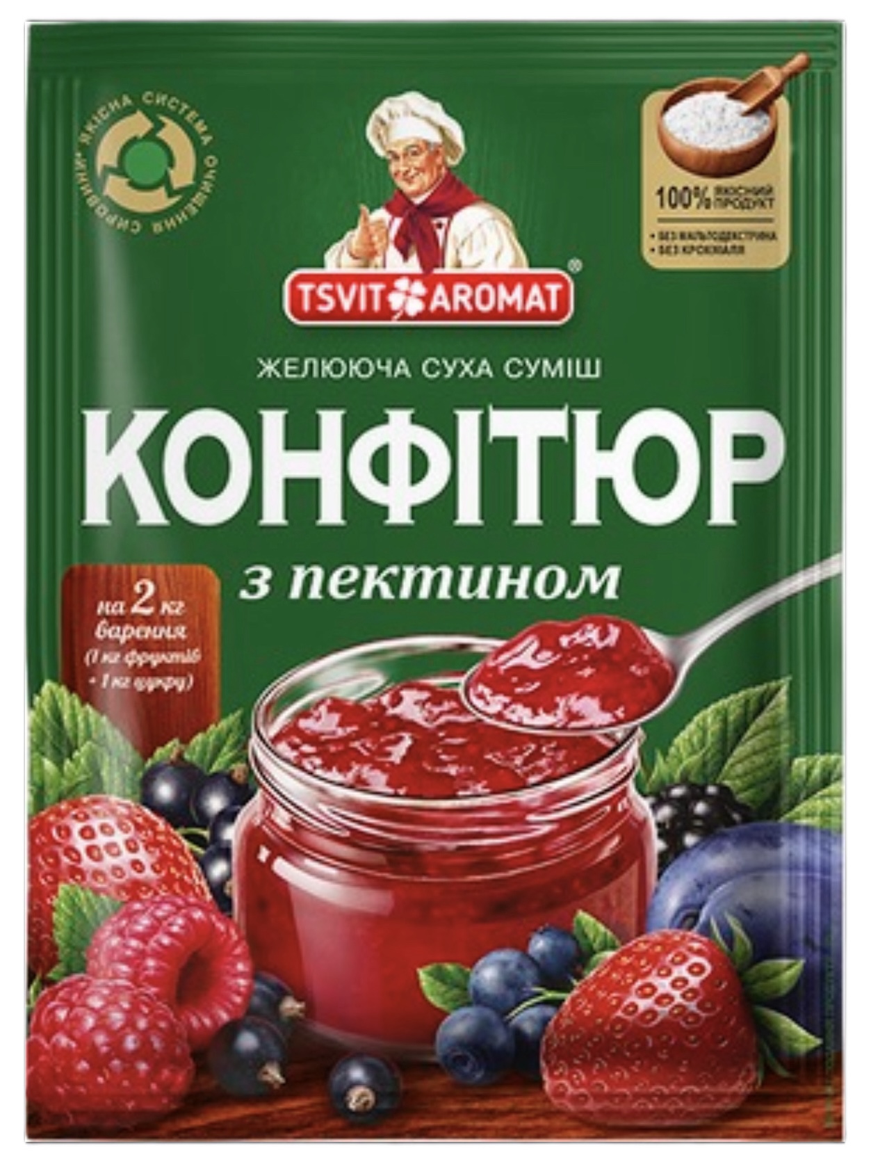 Конфитюр - желатиновая смесь, изготовленная на основе пектина, загустителя, полученного из яблок и цитрусовых. Благодаря пектину сокращается время приготовления и сохраняется вкус, цвет и аромат свежих фруктов. Незаменимая часть при приготовлении варенья и домашнего варения.