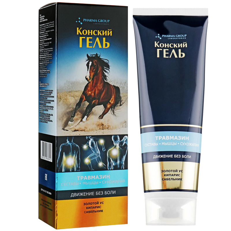 Конский гель «Травмазин» специально разработан для дополнительного ухода за кожей при травмах и болях, вызванных ушибами, растяжениями, травмами опорно-двигательного аппарата, спортивными растяжениями. Гель является оптимальной формой препарата, его легкая и быстро впитывающаяся консистенция обеспечивает высокое проникновение активных веществ через кожный барьер. Содержит активные ингредиенты, обладающие противовоспалительным и обезболивающим действием. Кипарис обладает противовоспалительной активностью, улучшает кровообращение. Это помогает уменьшить воспаление и уменьшить боль. Сабленик содержит большое количество дубильных веществ, что позволяет использовать его как противовоспалительное средство. Снимает боль при травмах. Благодаря раздражающему действию на ткани скипидар оказывает болеутоляющее действие. Его антисептические свойства помогают уменьшить воспаление. Камфора оказывает раздражающее действие на нервные окончания, что вызывает приток крови к месту воспаления, оказывая тем самым легкий обезболивающий эффект. Золотой ус стимулирует обменные процессы, укрепляет кровеносную систему и оказывает лечебное действие.