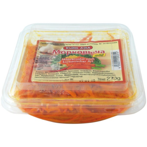Složení: mrkev 91%, řepkový olej, sůl, česnek, kyselina citronová, koriandru, černý pepř, chilli prášek, sójová omáčka (voda, sůl, sójové boby, cukr, pšeničná mouka), konzervační látky: sorbát draselný, látka zvýrazňující chuť: glutamát sodný.