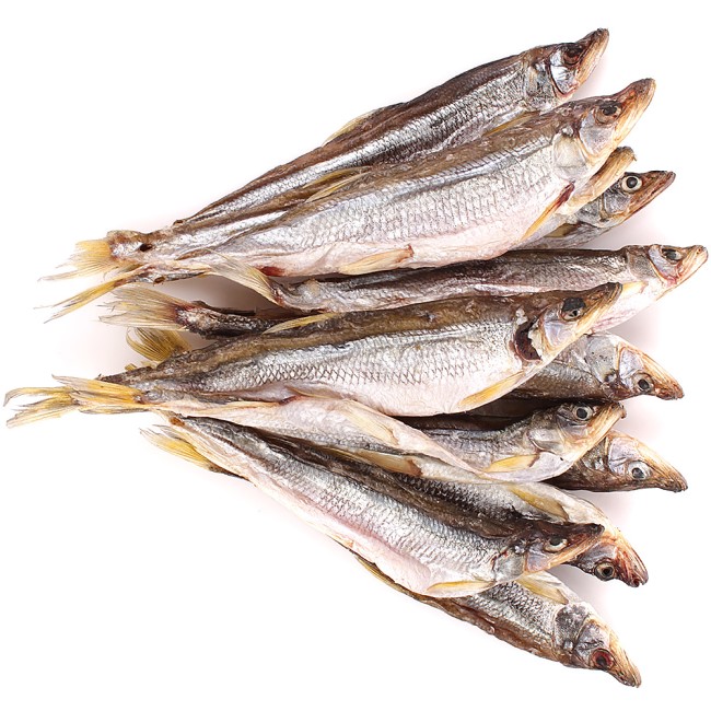 Koruška (Osmerus eperlanus) solená a sušená. S hlavou, nevykuchaná.