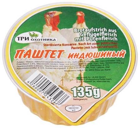 Složení: voda, kuřecí kůže 20%, mechanicky vykostěné kuřecí maso 11%, mechanicky vykostěné krůtí maso 10%, kuřecí játra 9%, pšeničná mouka, řepkový olej, sojový protein, emulgátor: E472c, bramborový škrob, sůl, sušená cibule, koření, extrakty koření, dextróza, antioxidant: askorbát sodný, konzervant: dusitan sodný.