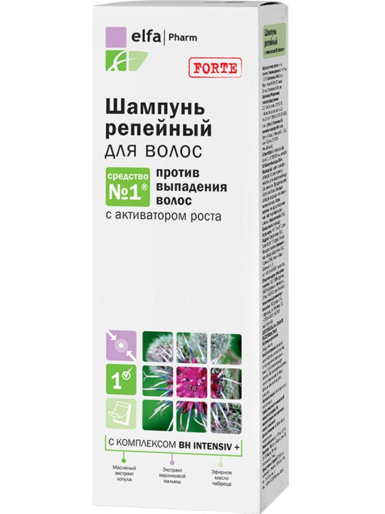Шампунь с лопухом от Elf Pharm предназначен для активного питания волосяных фолликулов, стимуляции их роста, обновления и укрепления кератинового слоя волос, а также защиты волосных прядей от повреждений. Шампунь отлично очищает кожу головы и готовит ее к восприятию целебных веществ. Шампунь можно использовать часто. Лопуховое масло, полученное из корней лопуха (Arctium Lappa), является лекарством № 1 от выпадения волос, богато витаминами, питательными веществами и эфирными маслами, а шампунь на его основе от фермы Elf Pharm позволяет не только предотвратить выпадение волос, но и делает волосы более мягкими и упругими, придает им здоровый блеск и помогает сохранить объем. Шампунь "Лопух" содержит активный комплекс "Bh intensiv +", который блокирует действие ферментов, вызывающих преждевременное выпадение волос, увеличивает активность волосяных фолликулов, стимулирует клеточный метаболизм и синтез кератина, улучшает питание волосяных фолликулов за счет улучшения кровообращения, регулирует выделение кожного сала, смягчает воспаления и раздражение кожи головы, снимает зуд.