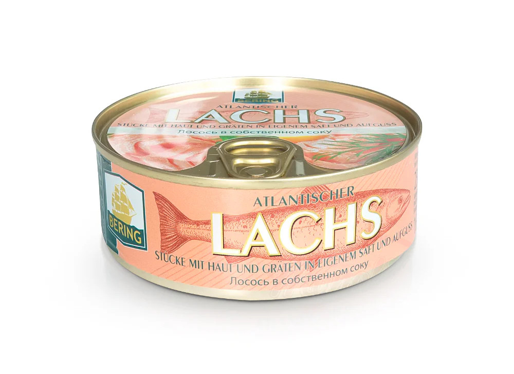 Лосось в собственном соку Bering, 230 г — качественный рыбный продукт из свежего филе лосося, приготовленный без добавления масла или других жиров. Сохраняет натуральный вкус и аромат рыбы, идеально подходит для бутербродов, салатов или как самостоятельное блюдо.