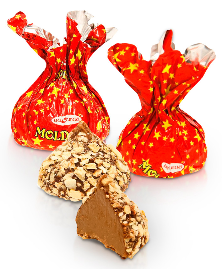 Конфеты "Moldova" от молдавской фабрики Bucuria представляют собой пралине, покрытые шоколадной глазурью и посыпанные мелко измельченными вафельными листами. Они привлекают своим необычайно вкусным сочетанием жареного арахиса, кокосового масла и какао.