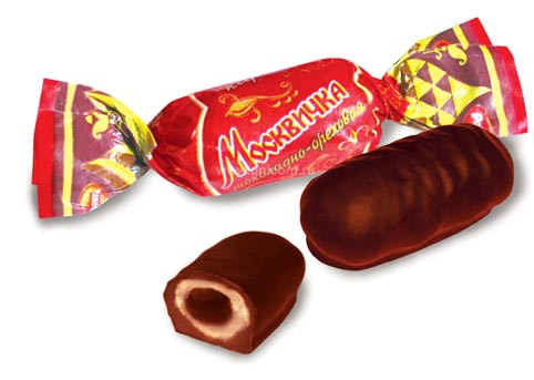 Легендарная конфета карамель Москвичка фабрики Рот Фронт это хрустящая белая карамель, покрытая шоколадной глазурью. Внутри конфеты нежная помадная начинка с добавлением какао, сгущенного молока и терпким коньячным ароматом. Вкус, знакомый многим поколениям, сочетание твердой карамели и тающей мягкой начинки.