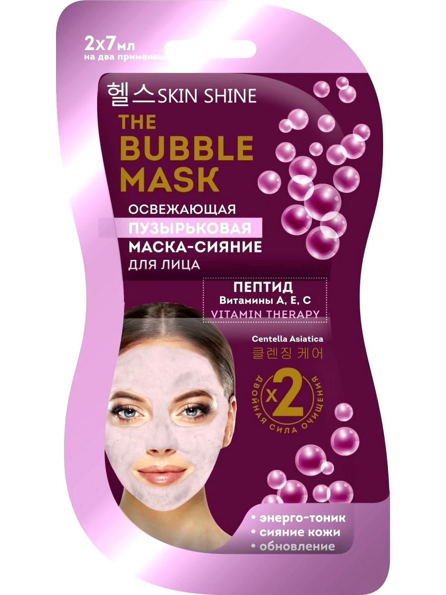 Пептиды и витамины А, С и Е - витаминотерапия. Благодаря своим компонентам маска осветляет кожу, насыщает ее пептидами и витаминами, возвращает здоровый вид и сияние. Тонизирует, делает кожу гладкой и отдохнувшей. Центелла азиатская укрепляет защитный барьер кожи. Комплексный пептид стимулирует процессы омоложения. Витамин С регулирует синтез коллагена, выравнивает кожу и придает ей сияние. Витамин А ускоряет метаболизм в клетках. Витамин Е защищает кожу от токсинов и свободных радикалов. При нанесении на кожу маска выделяет микропузырьки, которые массируют, очищают и насыщают кожу кислородом.