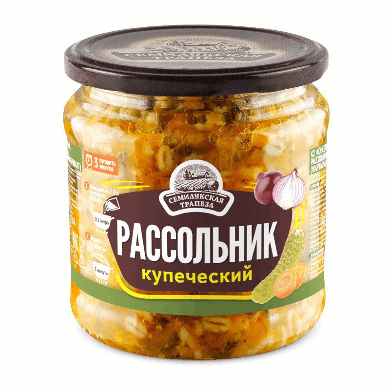 Рассольник бренда «Семилукская Трапеза» — это, безусловно, вкусное и ароматное блюдо, которое отлично подойдёт для сытного семейного обеда. При приготовлении продуктов всегда используются только качественные ингредиенты. Морковь, солёные огурцы и перловка в сочетании с отборным картофелем и луком, приправленные букетом ароматных специй, делают «Купеческий рассольник» не только вкусным, но и питательным.