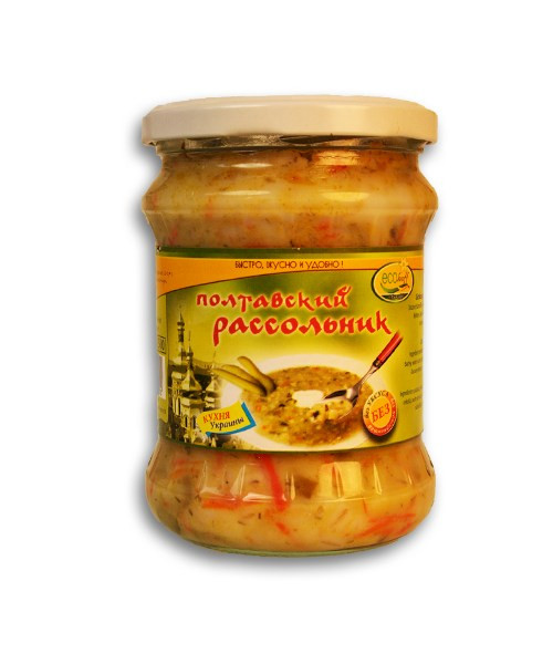 Состав: картофель, огурцы соленые 20%, крупа перловая, вода, морковь, лук, рапсовое масло, мука пшеничная, укроп, соль, усилиткль вкуса-глутамат натрия, экстракты специй.
