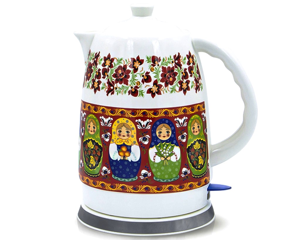 Чаепитие в России имеет многовековую традицию. Русская чайная церемония отличается обилием чая, угощений и приятной компанией. Классический вариант этой традиции – употребление черного (цейлонского, индийского и китайского) чая с молоком и сахаром. Для варианта «Чай вдвоем» и для повседневного употребления можно использовать зеленые, а также травяные и фруктовые чаи во всем их разнообразии. Электрочайник "Матрешка" изготовлена из высококачественной керамики. Он имеет красивый дизайн и станет важным элементом чаепития и украсит вашу кухню. Он имеет выключатель, который загорается во время работы и автоматически выключается.