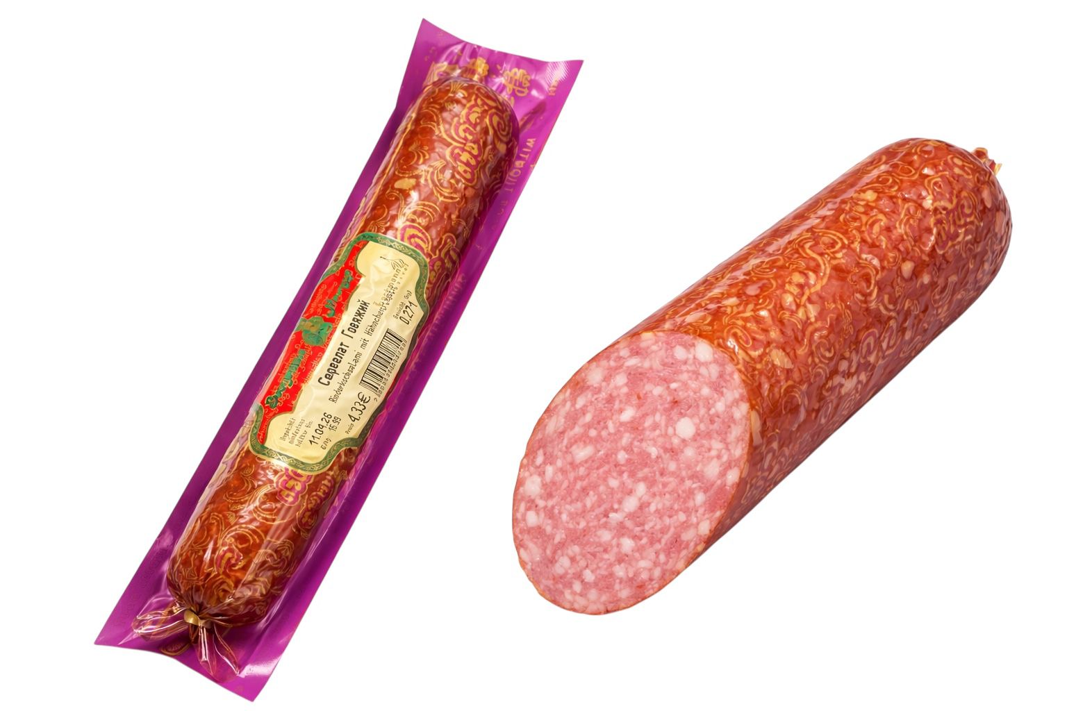 Это варёно-копчёная колбаса с насыщенным мясным вкусом и приятным ароматом специй. Изготавливается из говядины и/или куриного мяса с добавлением тщательно подобранных приправ, что придаёт продукту сочную текстуру и характерный вкус сервелата.
