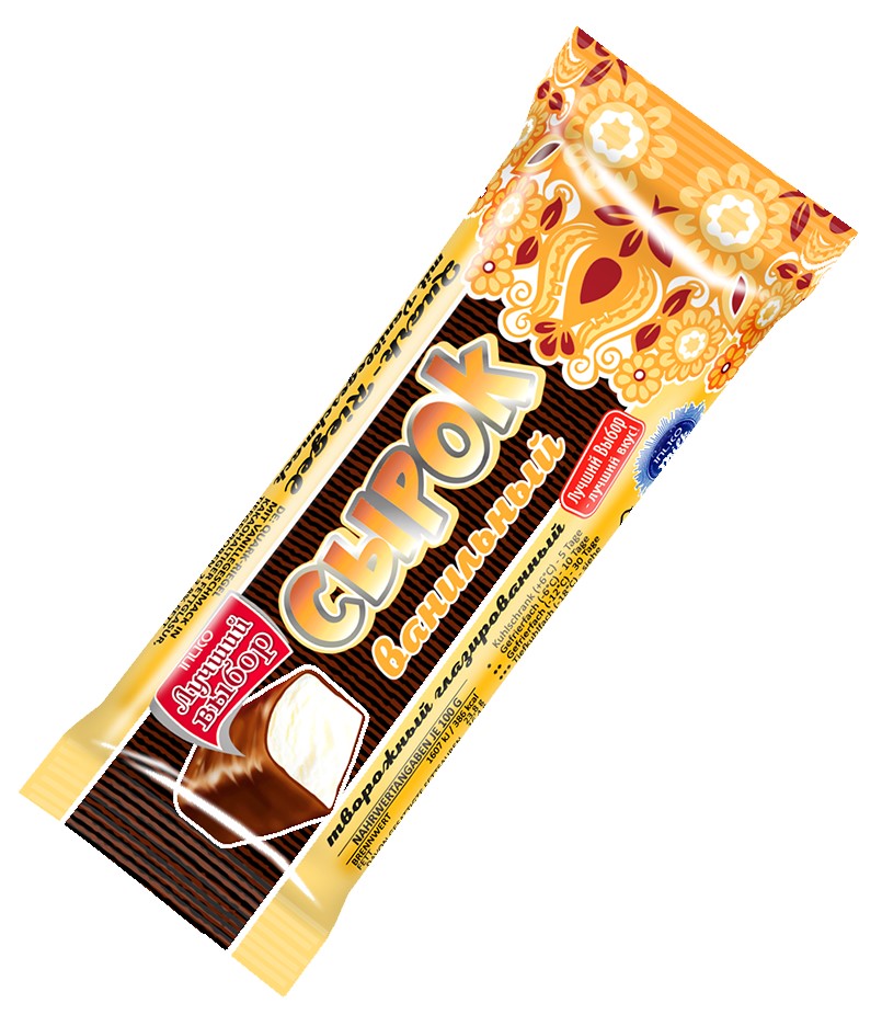 Состав: творог 55%, сахар, шоколадная глазурь на какао 15% (сахар, какао-порошок обезжиренный (10%), эмульгатор соевый лецитин, ароматизатор, ванилин 0,0003%), сливочное масло, модифицированный крахмал, ароматизатор.