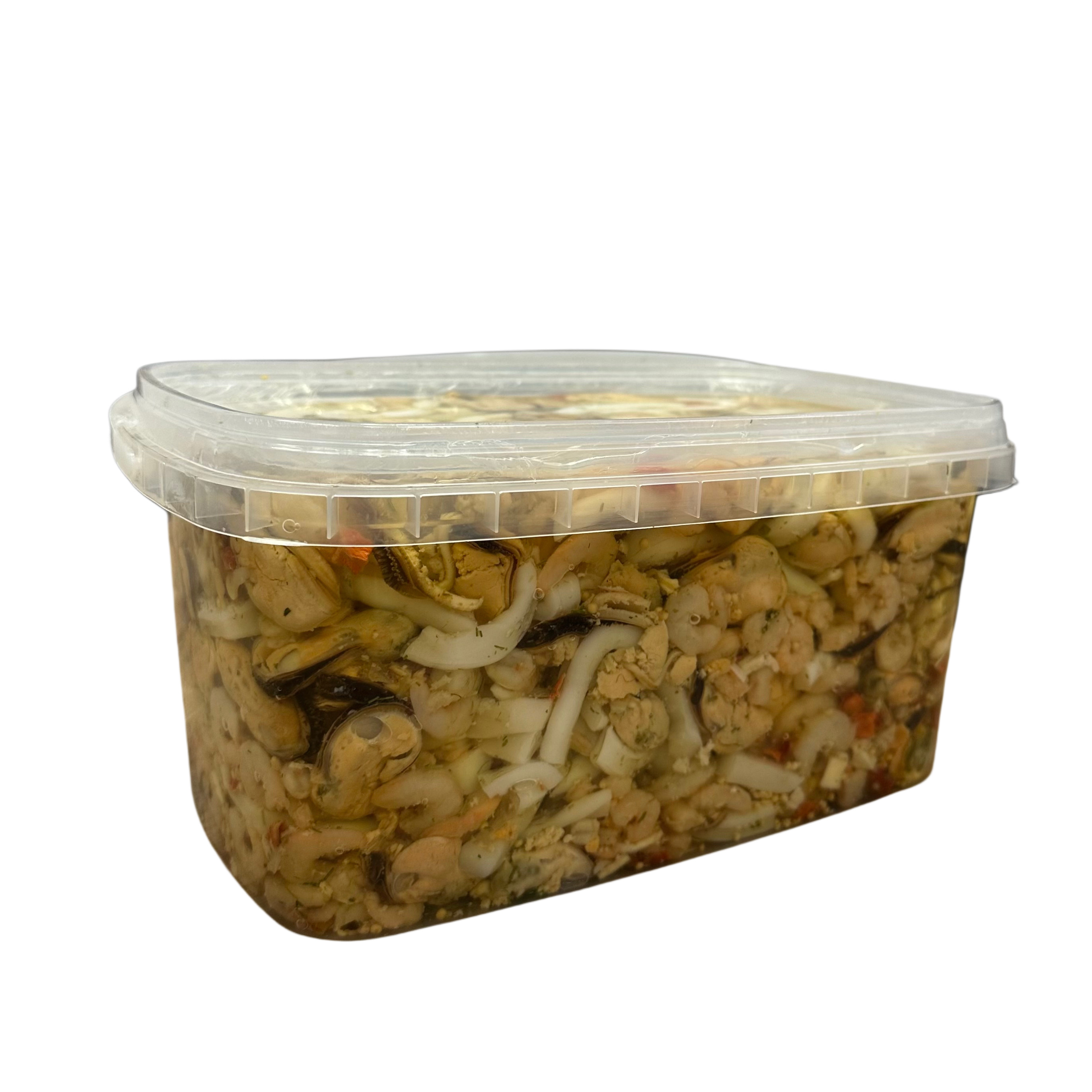 Состав: креветки, кальмары, мидии, уксус спиртовой, соль, сахар, лавровый лист, чёрный перец; масляный рассол 20% (масло рапсовое 28%, уксус спиртовой, соль, сахар, лавровый лист, чёрный перец, консерванты: бензоат натрия, глутамат натрия); сушёные овощи 2% (сладкая паприка, морковь, пастернак, лук, порей).