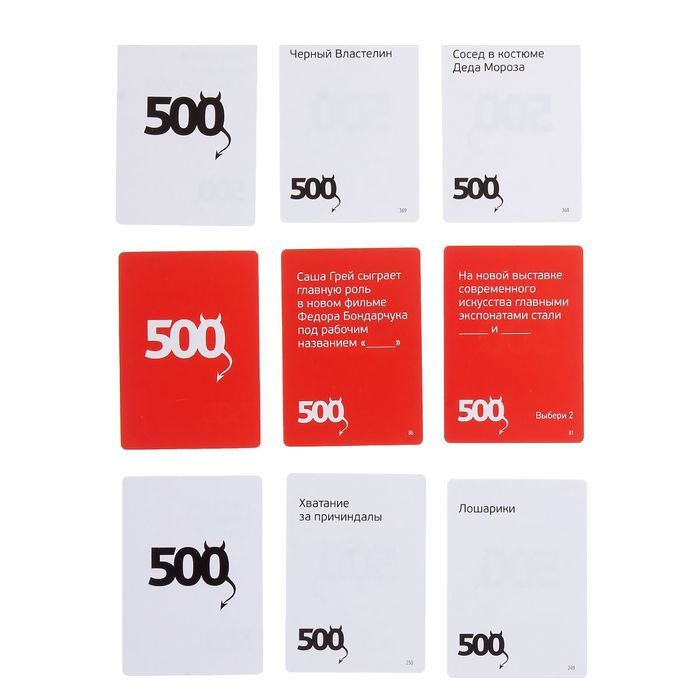 500 злобных карт – это простая и веселая настольная игра для совершеннолетней компании. Карты, конечно, злобные, порой даже бешенные, но при правильном обращении они становятся очень смешными. Сможете обуздать эти пять сотен злобных карт и вдоволь повеселиться?!