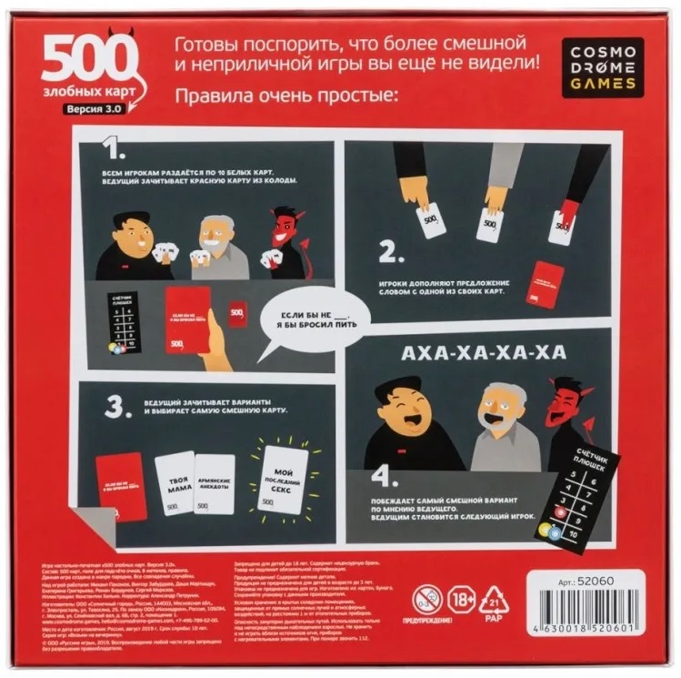 Настольная игра "500 злобных карт 3.0" (от 18 лет) - это увлекательная настолка для взрослых от издателя cosmodrome games – 500 злобных карт.