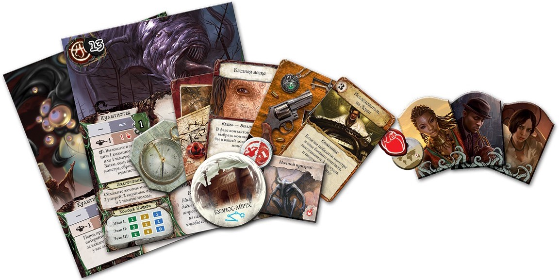 Комплектация: игровое поле, 4 карты памяток, 12 листов сыщиков, 12 фишек и 12 подставок для сыщиков, 4 листа Древних, 122 карты контактов, 51 карта Мифов, 126 карт: тайн, артефактов, активов, состояний, заклинаний, 167 жетонов, 4 кубика D6, правила игры.