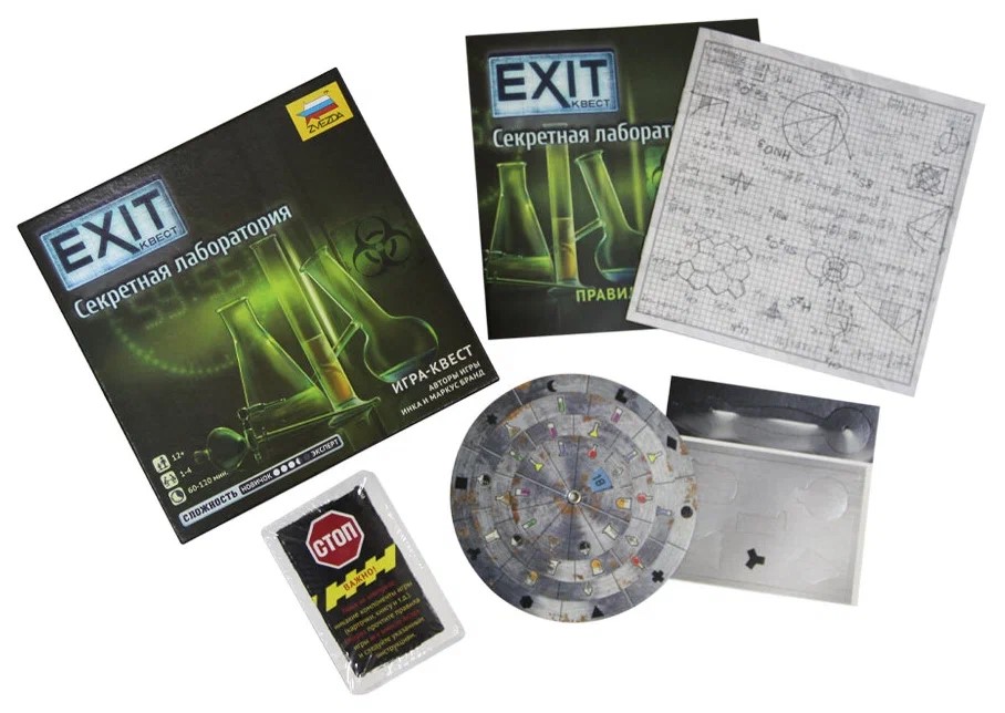«Exit Квест. Секретная лаборатория» — настольная игра, позволяющая пережить настоящий побег прямо не выходя из дома! Вас ждет множество загадок и головоломок. Проявите командный дух, чтобы как можно быстрее выбраться из этой ужасной ловушки, иначе вы станете жертвой этого ужасающего эксперимента!