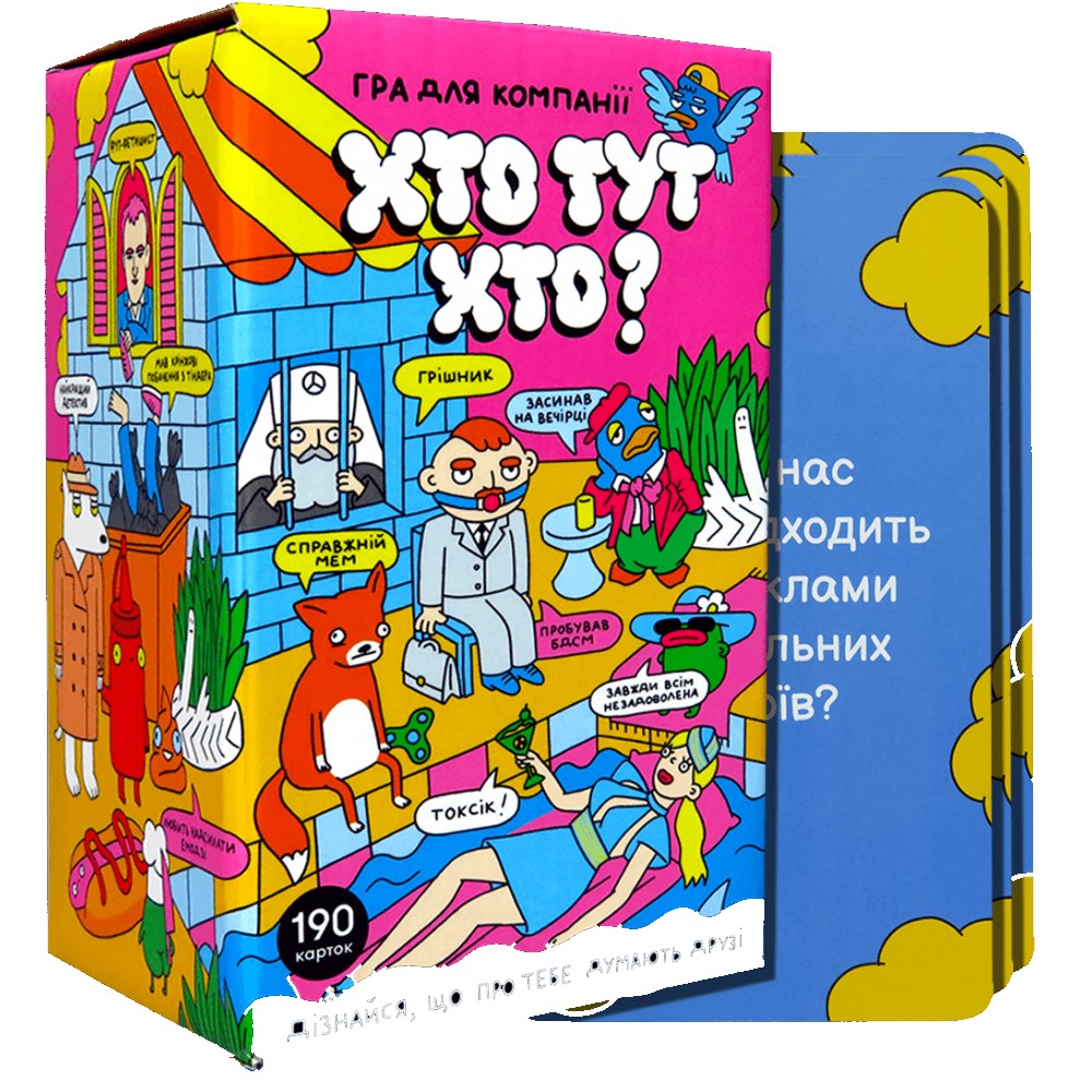 «Хто тут хто» — разговорная застольная игра для общества, в которой не зазорно показать на кого-то пальцем. Содержит 190 карточек, а также безалкогольную версию игры.