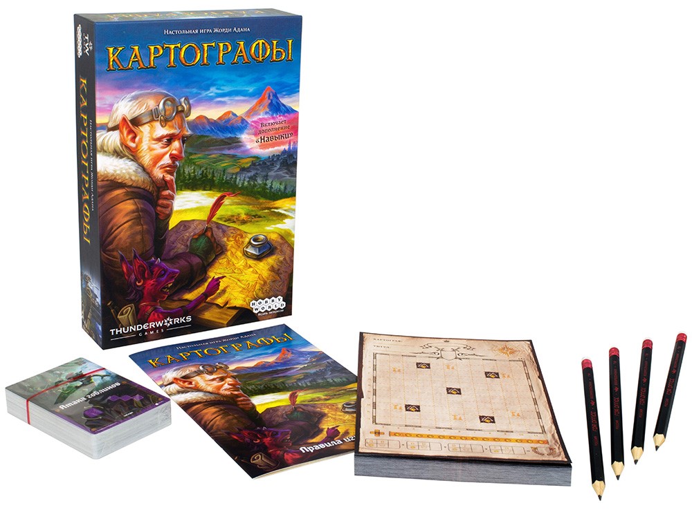 В игровой набор входит: Информационный бюллетень картографа (100 двусторонних листов-планировщиков), 16 карточек для подсчета очков, 13 карточек исследований, 4 карты ловушек, 4 карты сезона, 4 карты правил, 8 карт навыков, 4 карандаша, правила игры.