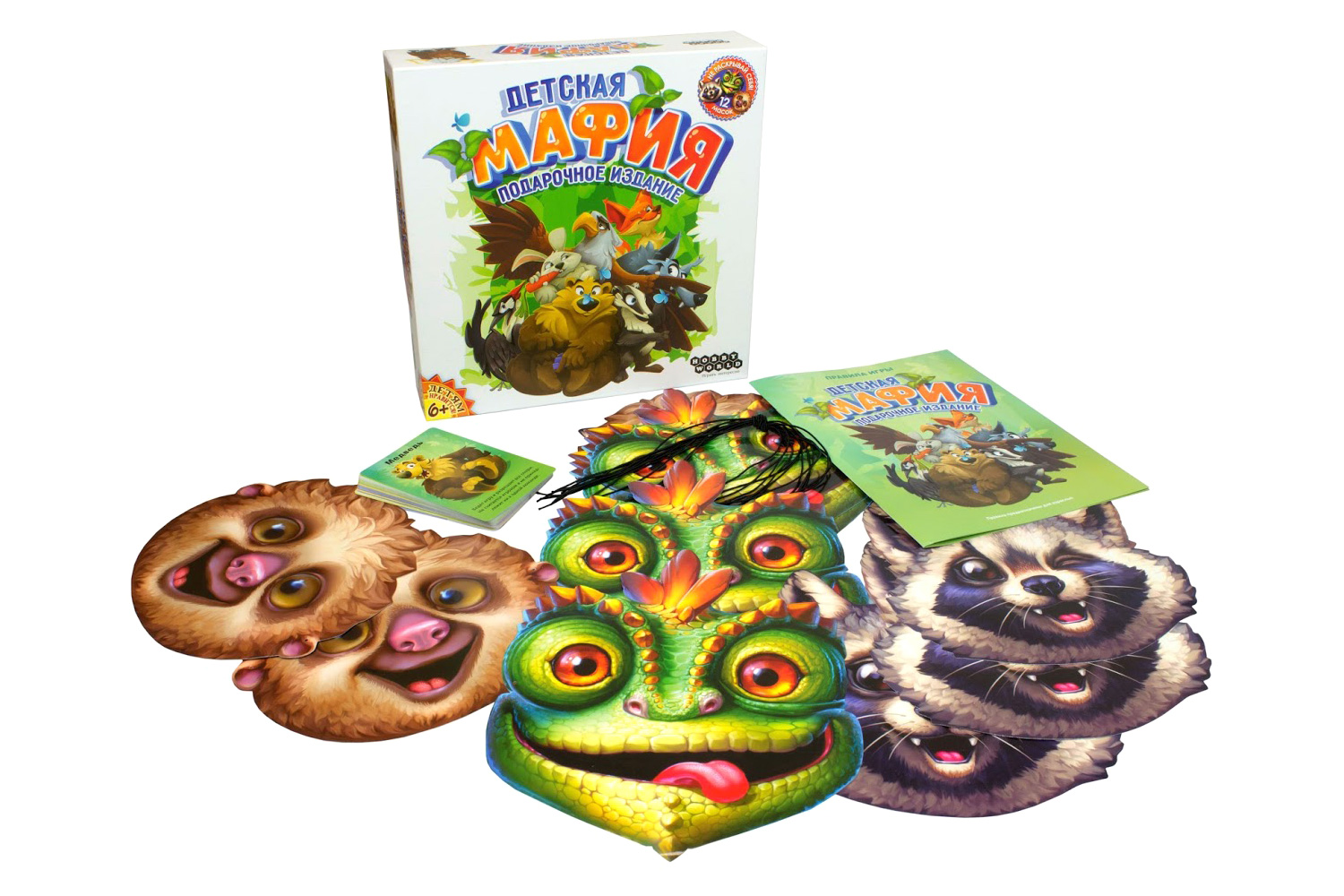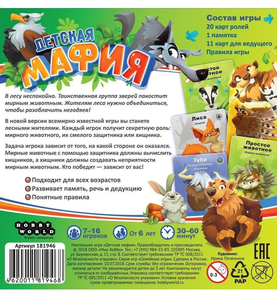 Настольная игра "Мафия детская" (от 6 лет) представляет собой адаптированный для детей вариант классической и всемирно известной психологической игры. Но пусть Вас нисколько не смущает её "детскость" – игра не подверглась никаким упрощениям, а даже наоборот, дополнилась интересными правилами и нововведениями. Единственное значимое отличие от взрослой версии заключается в адаптированном дизайне и в том, что все действия происходят не в городе, а в лесу; вместо мафии и мирных жителей у нас теперь соответственно хищники и мирные животные. Также в игре присутствует медведь-ведущий, который следит за игрой, но не принимает в ней непосредственное участие.
