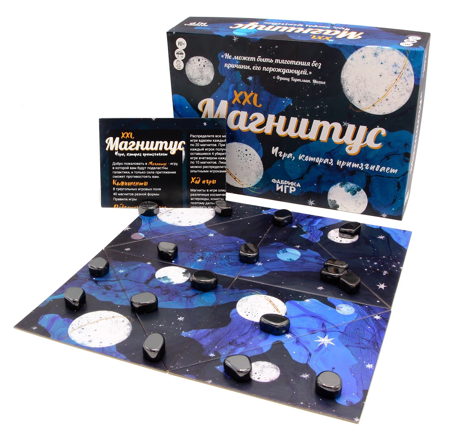 Сотворить собственную галактику – возможно! Окунитесь в мир звёздной пыли вместе с настольной игрой "Магнитус". Перед началом игры необходимо собрать поле, на котором будут размещаться магниты – своеобразные космические тела (планеты, астероиды и т. д.). Задача игроков – распределить их так, чтобы они не притянулись друг к другу и не произвели коллапс. Участники могут перемещать объекты без использования рук, а с помощью других магнитов. Победителем окажется тот, кто выложит все магниты на космическое поле, при условии, что они не притянутся друг к другу и не окажутся на столе. В этом случае другие игроки получают штрафные баллы, равные количеству оставшихся у их небесных тел. Также можно играть в одиночном режиме. Игра можно усложнить, добавив в ней правило чёрных дыр. Всё в ваших руках!