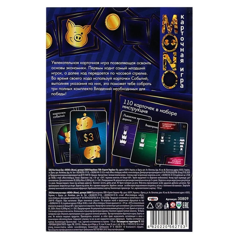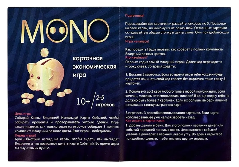 Настольная игра "Моно" (от 10 лет) – карточная экономическая игра, которая устроит настоящее соревнование между владельцами разной собственности. Чтобы победить соберите 3 полных комплекта Собственности разного цвета. Для достижения главной цели соблюдайте правила и используйте карты Действий, которые подкинут не мало сюрпризов. Вас жду хитрые сделки и приятные бонусы, а также жулики и оплата задолженностей. Игра вырабатывает способность к самостоятельному принятию решений, заставляет мыслить логически и продумывать каждый шаг.