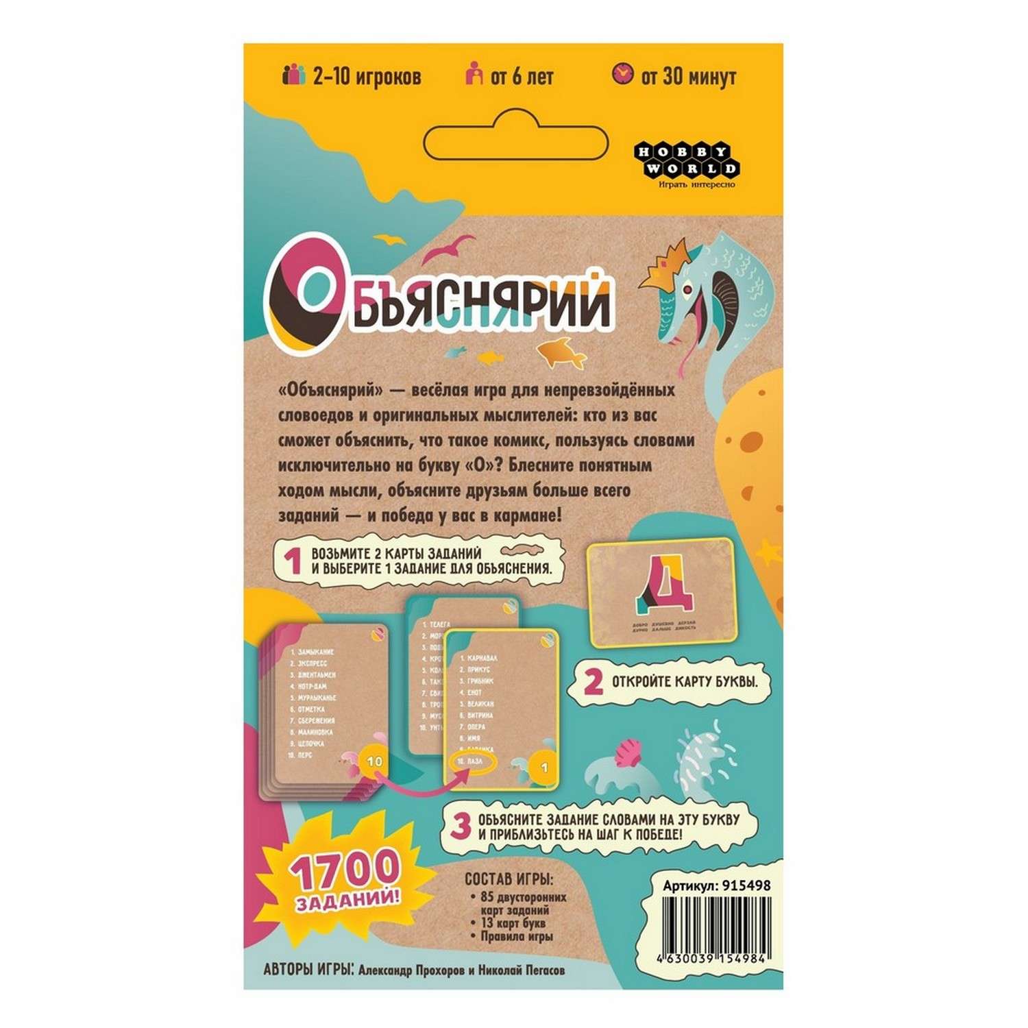 Комплектация: 85 двухсторонних карт заданий, 13 карт букв, правила игры