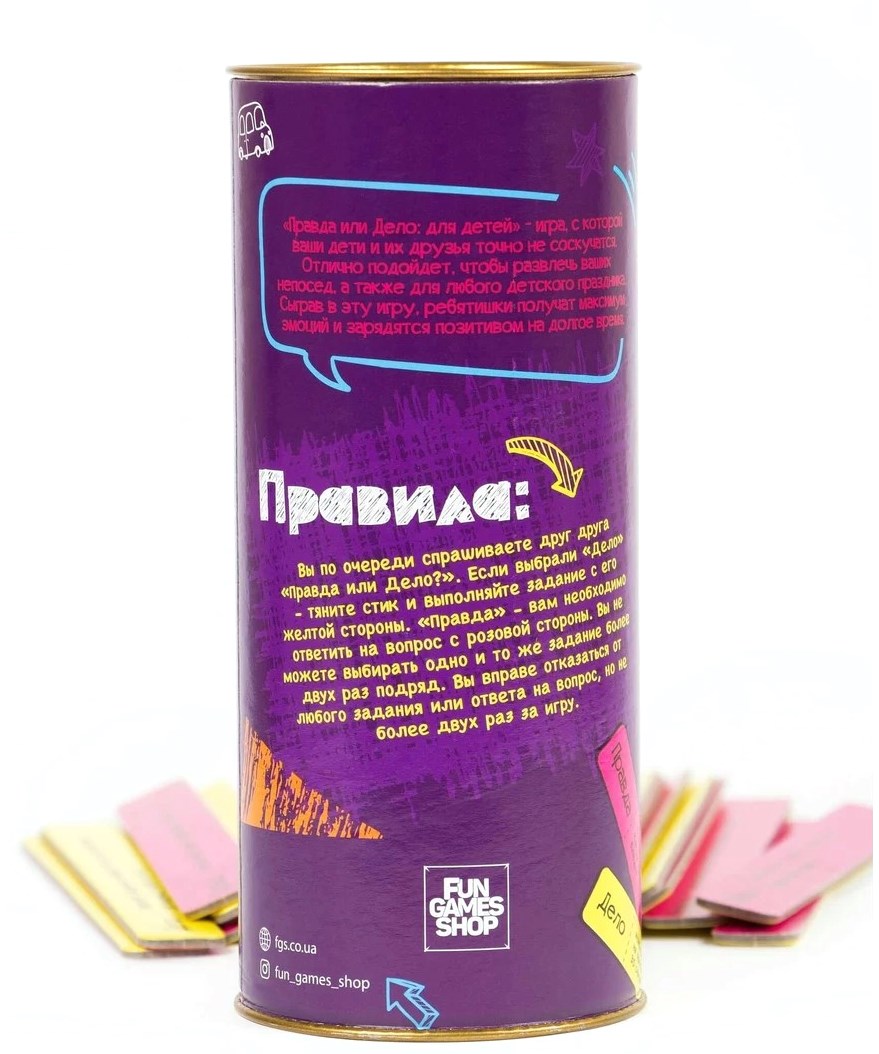 «Правда или Дело: Для детей» - специальная версия игры «Правда или Дело», предназначенная для юных игроков. Идеально подойдет для детских мероприятий, а также семейных посиделок. Интересные вопросы и забавные задания обеспечат отличное настроение всем участникам.