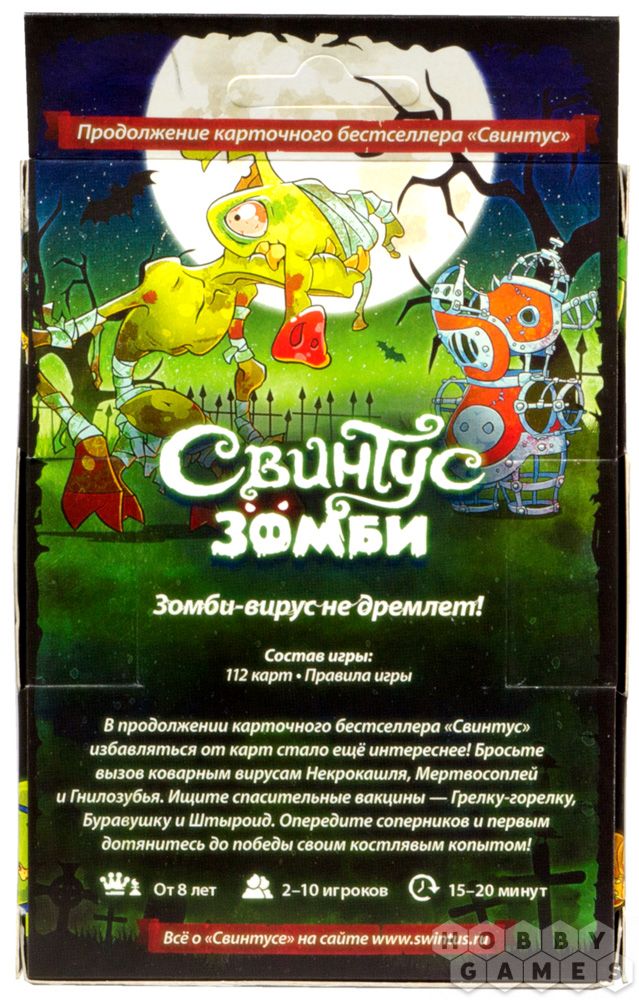 Настольная игра "Свинтус. Зомби" (от 13 лет) — это очередная игра в мегапопулярной серии карточных игр «Свинтус» для тех, кто пытается выжить в офисе. Теперь избавиться от всех карт на руке стало ещё сложнее — и ещё интереснее! Заражайте соперников зомби-вирусами, ищите спасительные вакцины и станьте первым, кто дотянется до победы своим костлявым копытом!