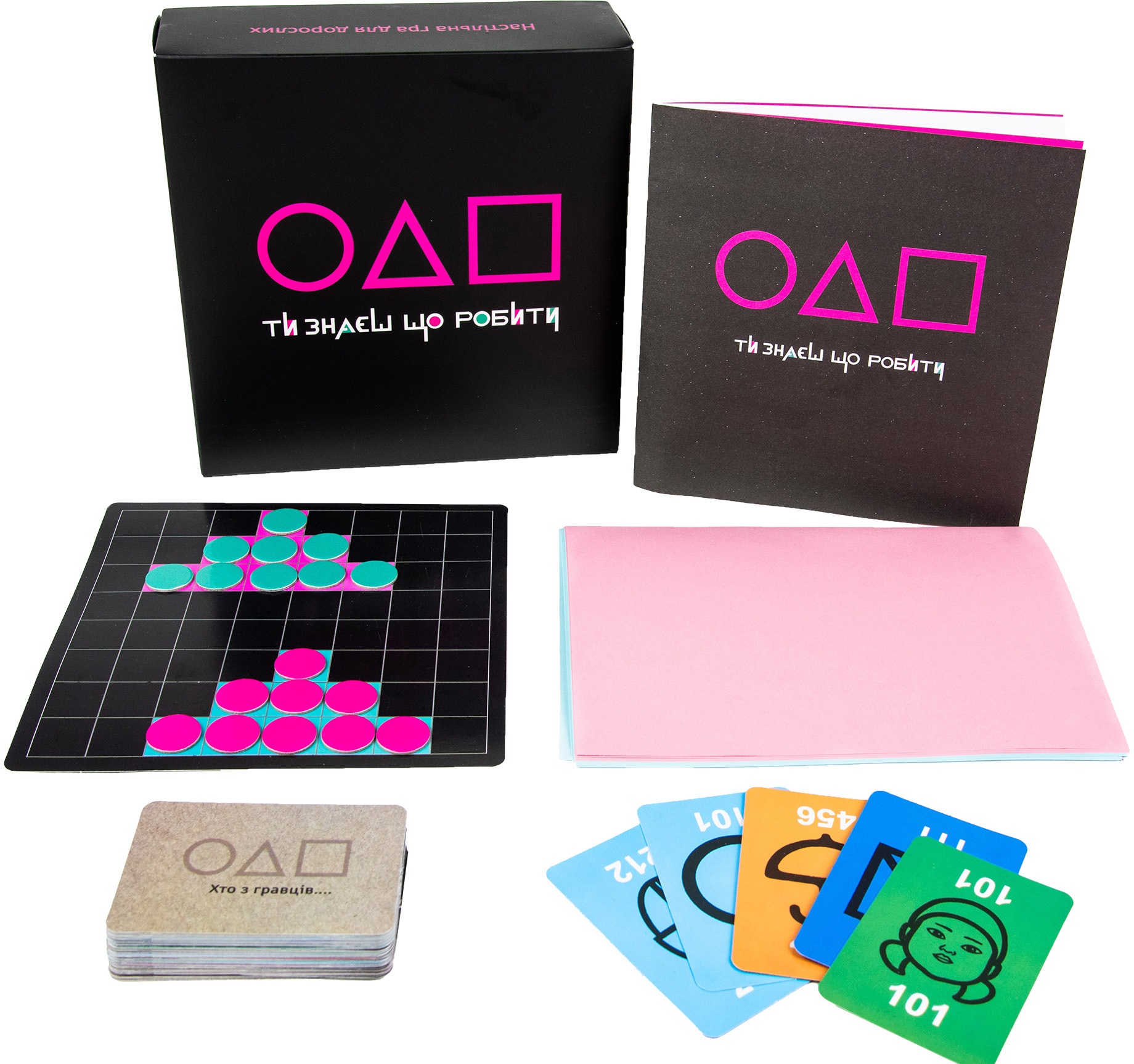 Настольная игра "Ти знаєш що робити" (18+) укр - это набор игр, вдохновленных сериалом "Игра в кальмар". Мы создали этот набор для того, чтобы в него можно было играть как в большой компании, так и вдвоем.
