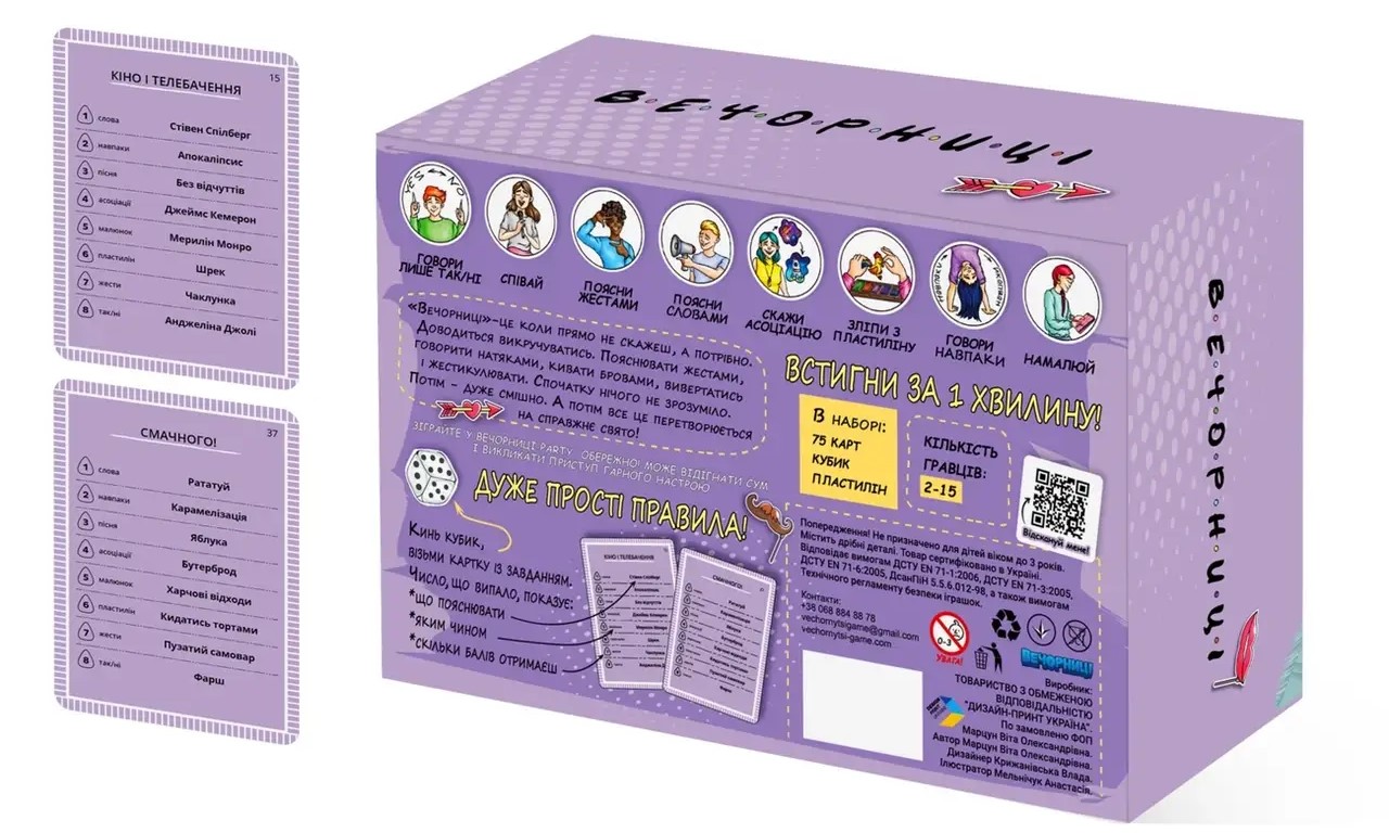 «Вечорныци» — игра для любой компании, будь то взрослой или маленькой. Эта коробка не только очень компактна и удобна для игр на ходу, но и содержит только самые увлекательные игровые режимы!