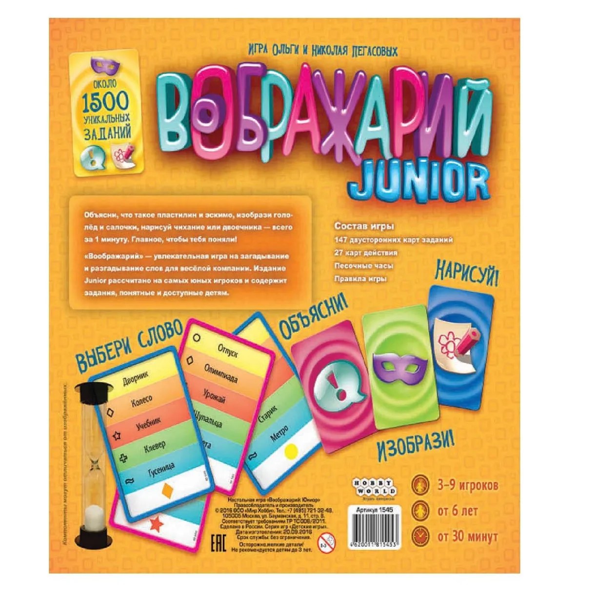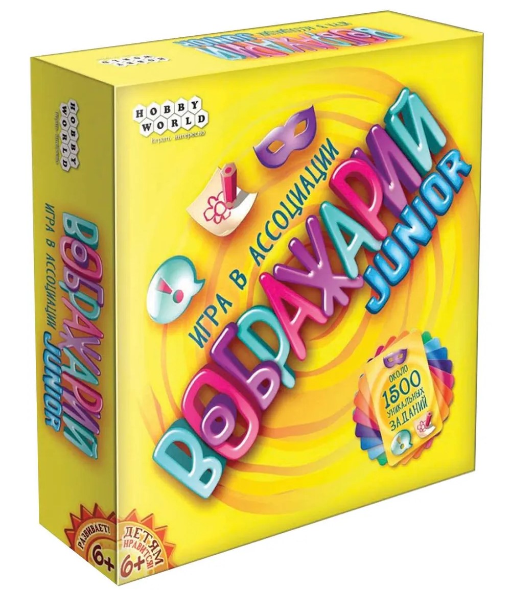 Настольная игра "Воображарий. Джуниор" (от 6 лет) — это новый представитель в отличной серии настольных игр, построенных на ассоциациях. На этот раз игра была разработана специально для детей от шести лет и старше. Это отражается в адаптированных правилах, дизайне и, конечно, более подходящем наборе слов на карточках. Не бойтесь, что слова станут слишком простыми — игра предлагает два уровня сложности, где среди простых заданий вы встретите слова тип «мультфильм», «детский сад» или «микроб», а среди сложных «гордость» или «блокада».