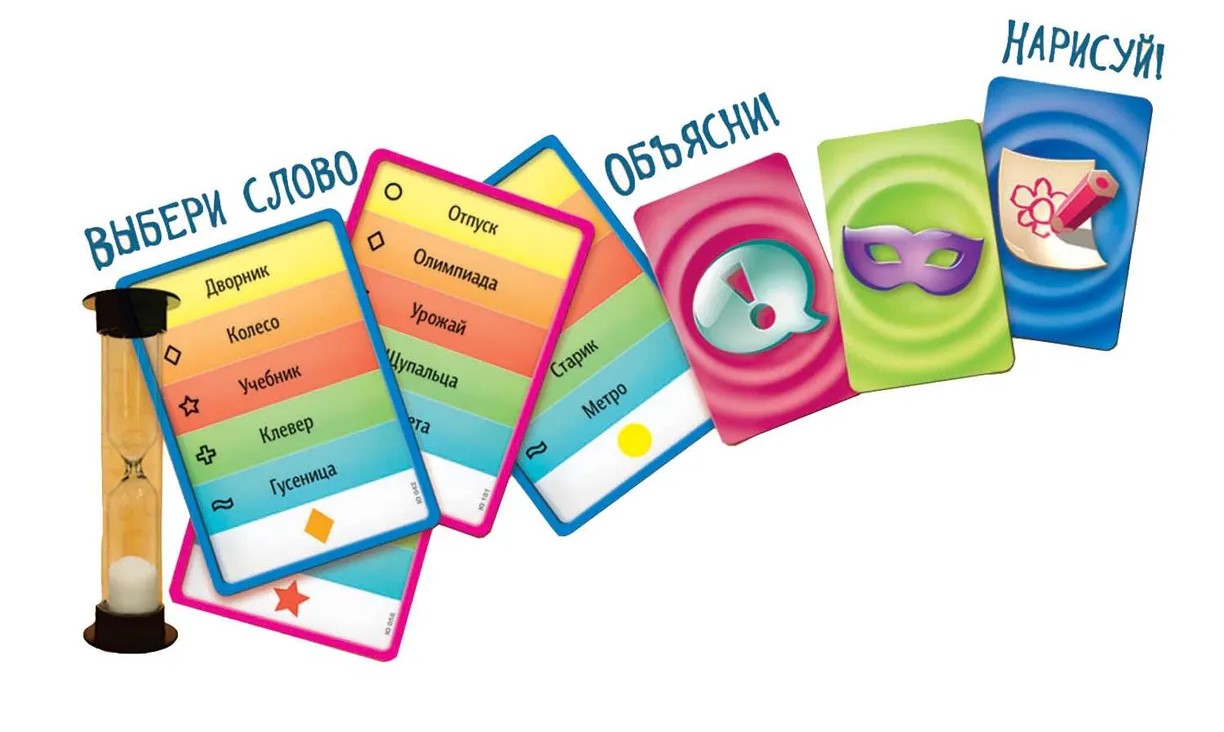 Комплектация: 147 двусторонних карт заданий; 27 карт действия; песочные часы; правила игры.