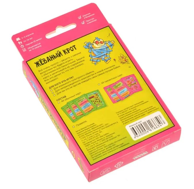 Настольная игра "Жёваный крот" (от 18 лет) – весёлая игра для вечеринок. Неважно, в какой момент праздника вы решите сыграть – в середине или в начале, ведь так или иначе всем вам предстоит "подогреться". А это, как известно, отличный способ узнать получше своих друзей, а с новыми лицами – побыстрее познакомиться.